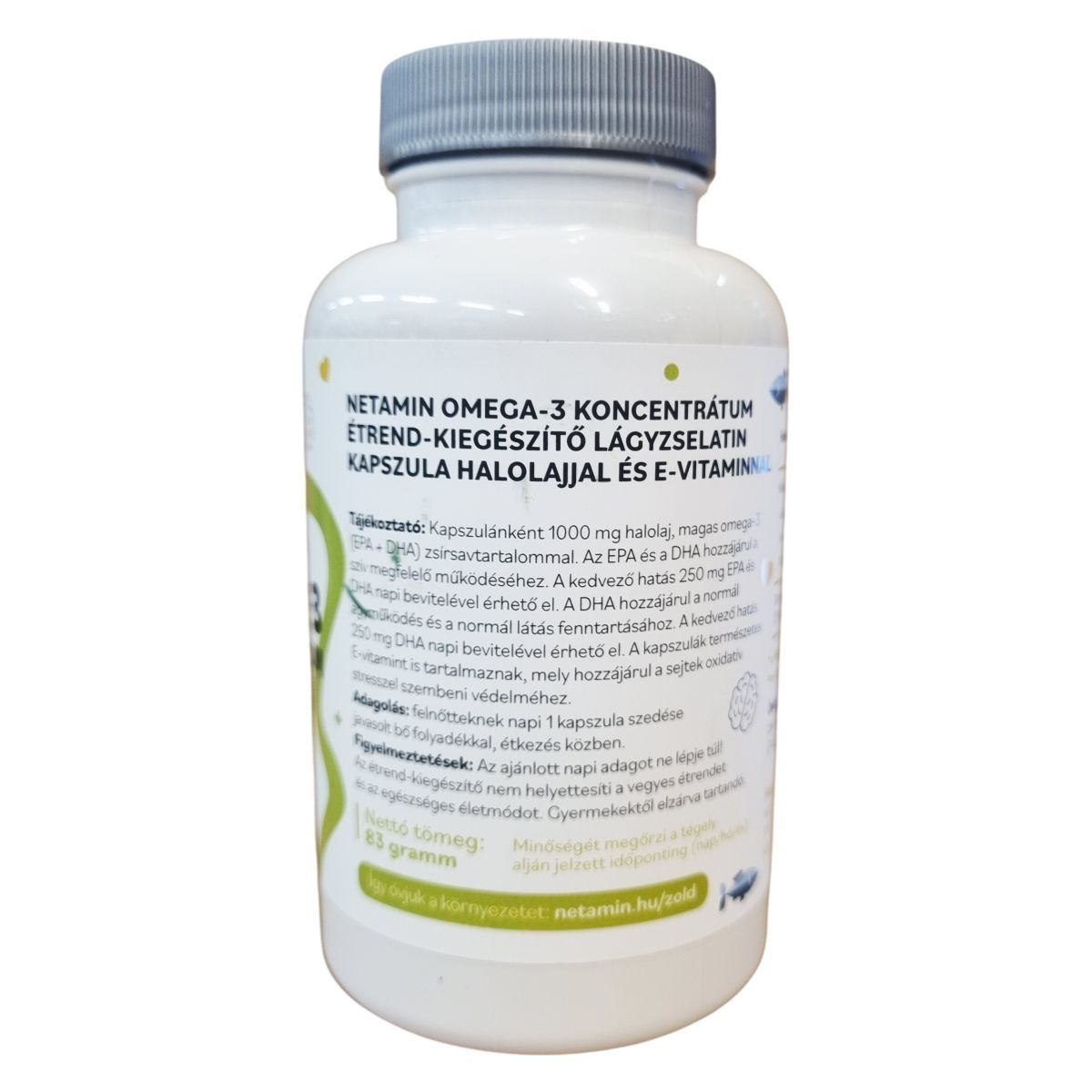 A netamin Omega-3 Koncentrátum étrend-kiegészítő lágyzselatin kapszula, amely halolajat és természetes E-vitamint tartalmaz. Egy kapszula 1000 mg halolajat tartalmaz, magas EPA és DHA zsírsavtartalommal, amelyek hozzájárulhatnak a szív megfelelő működéséhez, az agyműködés és a látás fenntartásához a napi ajánlott bevitel szerint. A természetes E-vitamin antioxidáns tulajdonsággal rendelkezik, így támogathatja a sejtek oxidatív stresszel szembeni védelmét. A kapszula lágyzselatinból készül, amely glicerint és ivóvizet is tartalmaz a megfelelő állagért. A termék nettó tömege 83 gramm, és a csomagolás 60 kapszulát tartalmaz, ami két havi adagnak felel meg. Az ajánlott adagolás naponta egy kapszula, bő folyadékkal, étkezés közben. A termék használata mellett javasolt a vegyes étrend és az egészséges életmód betartása.