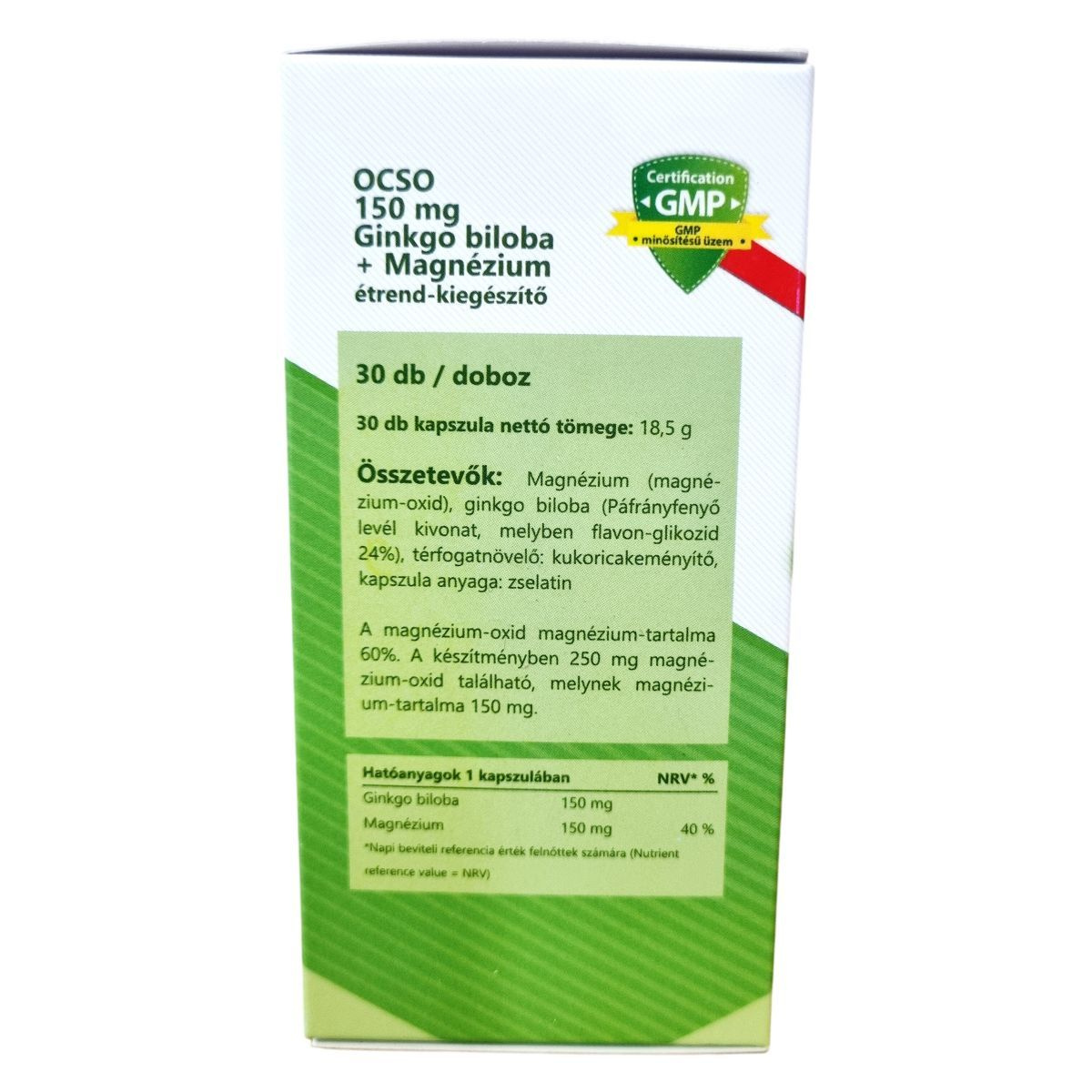 Az OCSO Ginkgo Biloba + Magnézium étrend-kiegészítő 30 kapszulát tartalmaz, melyek mindegyike 150 mg ginkgo bilobát és 150 mg magnéziumot biztosít. A ginkgo biloba hozzájárulhat a kognitív funkciók támogatásához, míg a magnézium segíthet az idegrendszer megfelelő működésében. A termék bio minősítésű, és a magnézium-oxid magnézium-tartalma 60%. A készítmény nem helyettesíti a vegyes étrendet és az egészséges életmódot. A forgalmazó a Bio Planet Kft., székhelye Szegeden található.