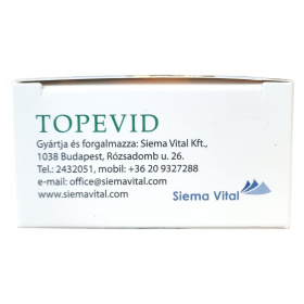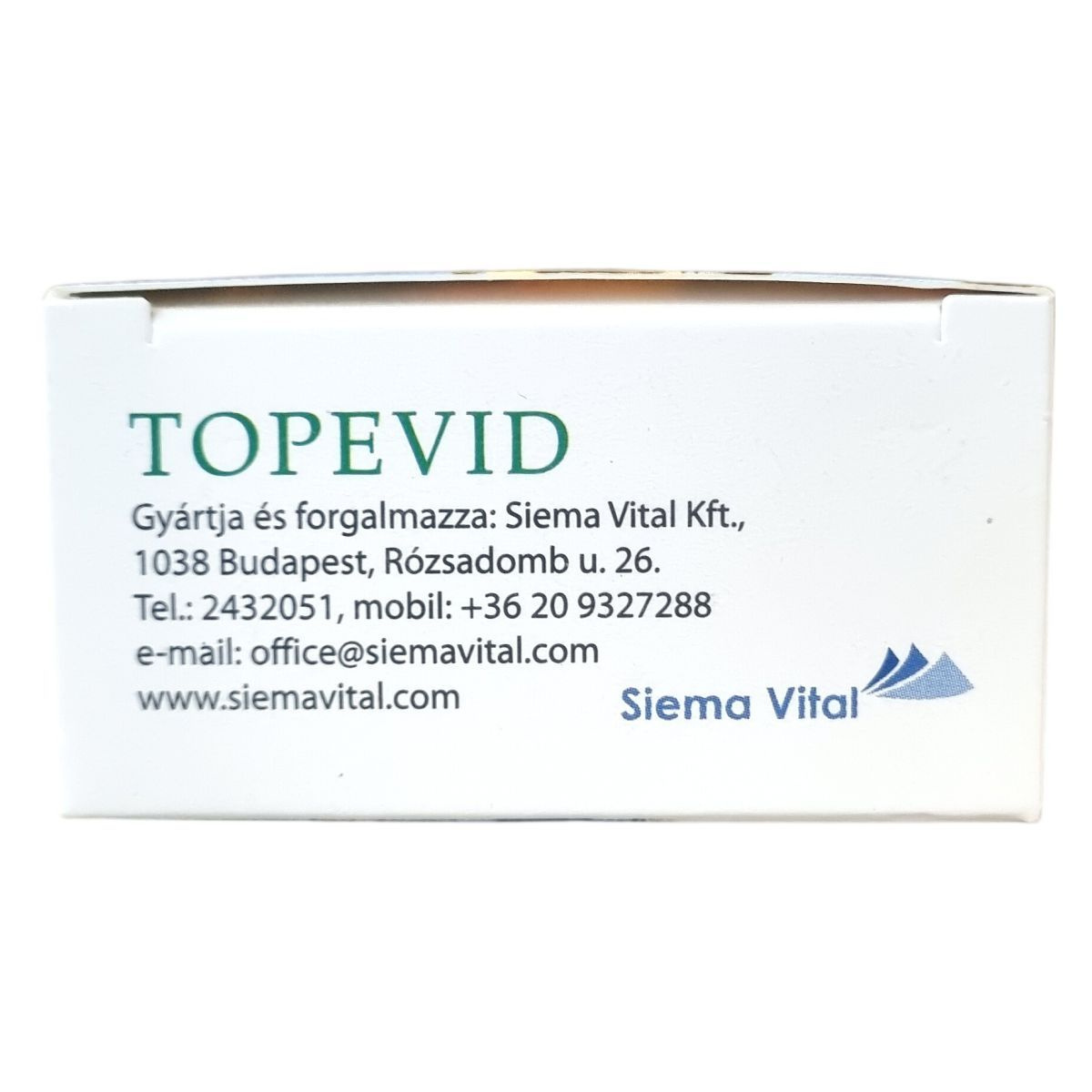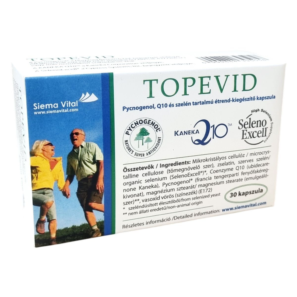 A TOPEVID étrend-kiegészítő kapszula Pycnogenol®, Co Q10 és szerves szelén kombinációját tartalmazza, melyek együttesen hozzájárulhatnak a szervezet antioxidáns védelméhez. A Pycnogenol® a Horphag Research Ltd. bejegyzett védjegye, alkalmazása több amerikai és nemzetközi szabadalom által védett. A Coenzyme Q10 (Kaneka Q10™) a Kaneka Corporation védjegye, míg a szerves szelén (SelenoExcell®) a Cypress Systems, Inc. bejegyzett védjegye, amely szeleindúsított élesztőből származik. A kapszula nem tartalmaz hozzáadott cukrot, sót, keményítőt, laktózt, glutént, valamint szintetikus ízesítőket és tartósítószereket, így megfelelő választás lehet bizonyos étrendi igények mellett is. A kapszula zselatin alapú, valamint nem állati eredetű magnézium-sztearáttal készül. A termék nettó tömege 7 gramm, és energiája 21 kcal. A gyártás és forgalmazás a Siema Vital Kft. feladata, melynek székhelye Budapesten található.