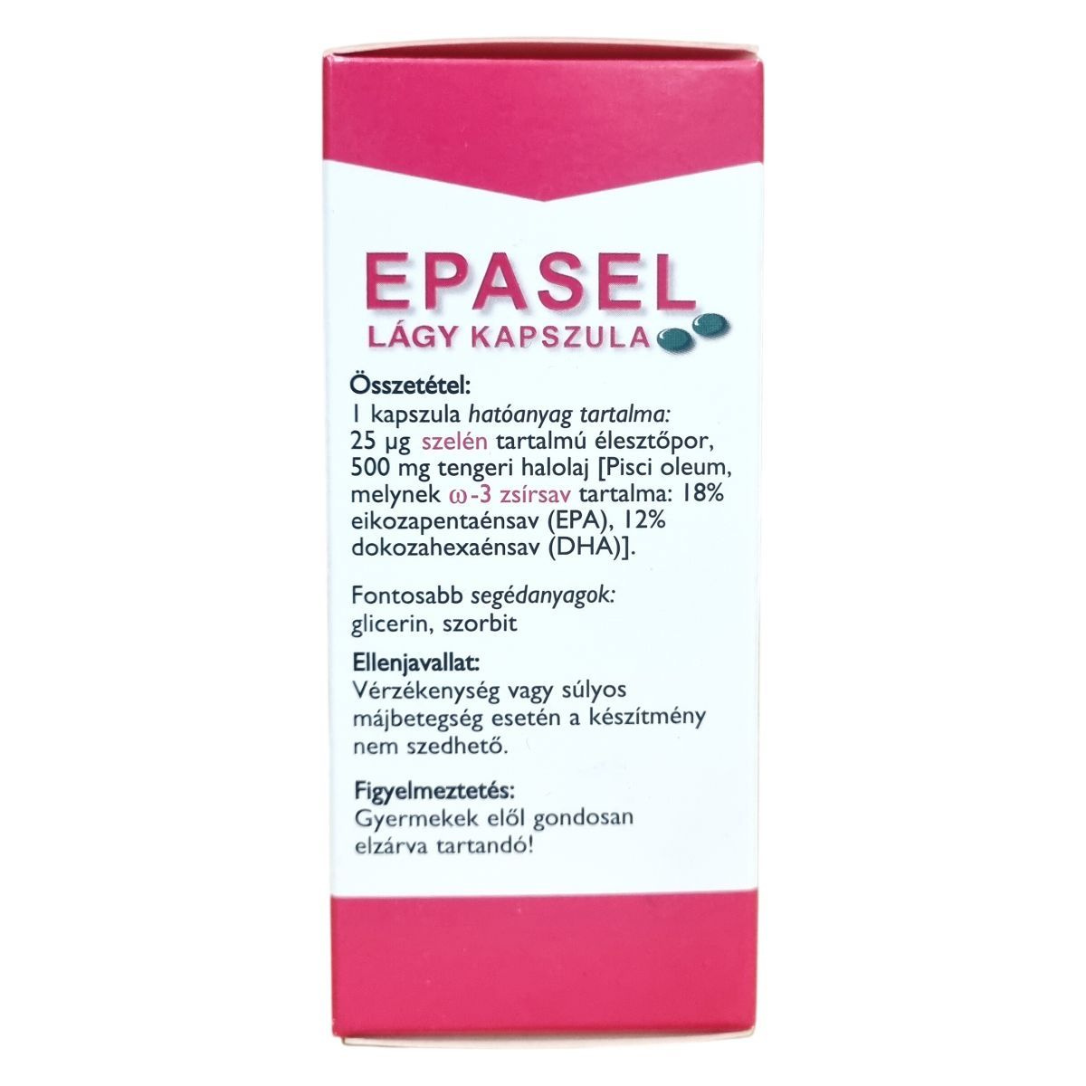 Az EPASEL lágy kapszula egy nem gyógyszernek minősülő gyógyhatású készítmény, amely hatását szakirodalmi adatok és állatkísérleti eredmények támasztják alá. Különösen ajánlott szívinfarktus vagy más szív- és keringési betegségek kialakulásának megelőzésére. Egy kapszula 500 mg tengeri halolajat tartalmaz, melynek ω-3 zsírsav-tartalma 18% eikozapentaénsav (EPA) és 12% dokozahexaénsav (DHA), valamint 25 µg szelént tartalmazó élesztőport. Fontosabb segédanyagok a glicerin és a szorbit. A készítmény nem alkalmazható vérzékenység vagy súlyos májbetegség esetén. Tárolása legfeljebb 25 °C-on ajánlott, és gyermekek elől gondosan el kell zárni.