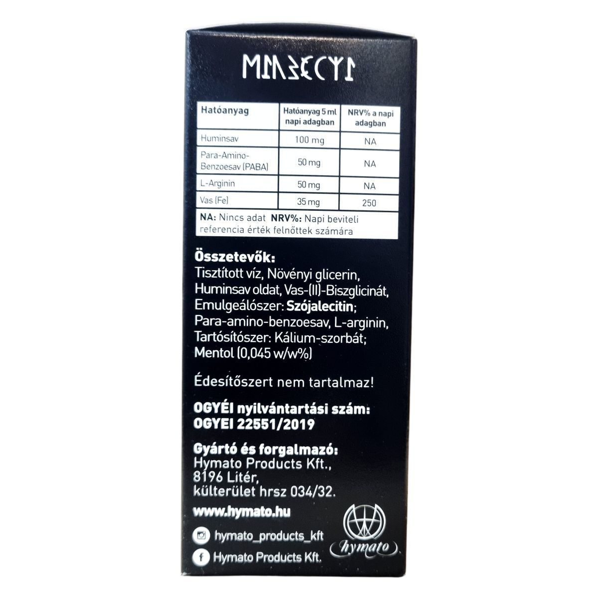 Tisztított víz, Növényi glicerin, Huminsav oldat, Vas-(II)-Biszglicinát, Emulgeálószer: Szójalecitin, Para-amino-benzoesav, L-arginin, Tartósítószer: Kálium-szorbát, Mentol (0,045 w/w%)