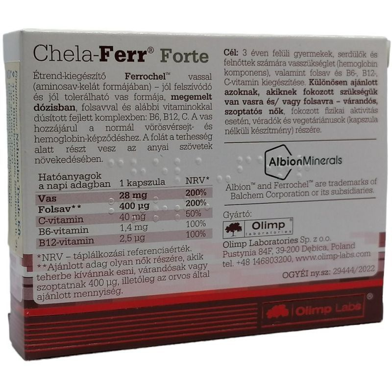 Az Olimp Chela-Ferr Forte kiválóan felszívódó Ferrochel „szerves” vasat tartalmaz a hasznosulásához szükséges vitaminokkal és a vérképzést segítő egyéb összetevőkkel. A szervezet lényegesen nagyobb mértékben képes hasznosítani az ilyen aminosavas kötésű ásványi anyagokat, valamint az emésztőrendszer is jobban képes tolerálni az ilyen új generációs vegyületeket, mivel szerves anyagként képes kezelni a bevitt ásványokat.