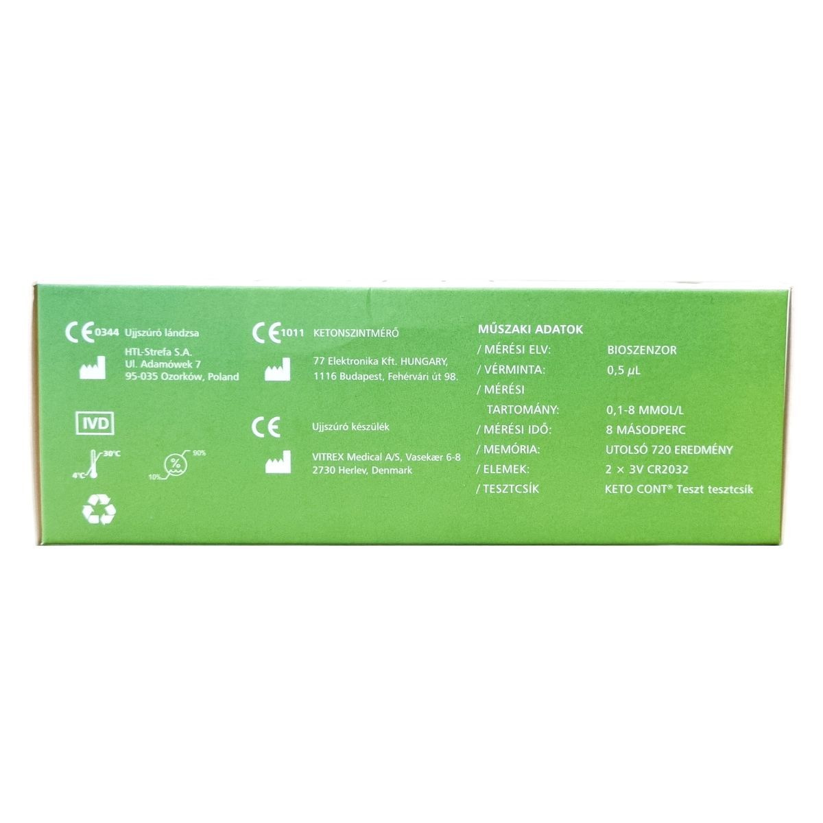 A készülék a KETO Cont® Teszt tesztcsíkokkal együtt használható vérketonszint mérésére, gyors eredményt biztosítva önellenőrzési célokra.