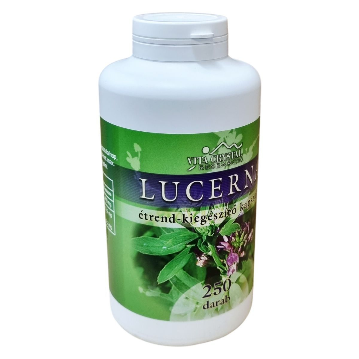 A Vita Crystal Lucerna étrend-kiegészítő kapszula 250 darabos kiszerelésben kerül forgalomba. A kapszula fő összetevője a lucernafű őrlemény, mely polifenolokat tartalmaz, különösen bioflavonoidokat, melyeket a Flavin7 bioflavonoid komplex biztosít vörös szőlő- és más gyümölcsmagból származó szárítmányok formájában. A termék zöld kapszulája hipromellózból készül, mely cink-oxiddal, karragénen alapuló sűrítőanyaggal és glicerin emulgeálószerrel egészül ki. A csomag nettó tömege 130 gramm, a kapszulák egyenként 520 mg súlyúak. A termék a napi 1 vagy igény esetén 2 kapszulás adagolásban javasolt, bő vízzel történő lenyeléssel. Felhívjuk a figyelmet arra, hogy az ajánlott mennyiség túllépése nem javasolt, és a készítmény nem helyettesíti a változatos, kiegyensúlyozott étrendet és az egészséges életmódot.