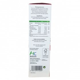 A bio gránátalmalé eredetileg Perzsiából származik, ma különböző trópusi és szubtrópusi országokban termesztik, jelen termék esetében Törökországból származik. Az ital 100%-ban természetes gyümölcslé, amely ellenőrzött biológiai gazdálkodásból származik és szigorú minőségellenőrzési folyamatokon megy keresztül, valamint kíméletes feldolgozással készül, hogy megőrizze frissességét és értékes anyagait. A csomagolás FSC tanúsítvánnyal rendelkezik, ezzel is támogatva a fenntartható erdőgazdálkodást. A palack körülbelül 5 adag 60 ml-es részt tartalmaz. A termék vegán és bio minősítésű, valamint fogyasztása frissítő és természetes módját jelentheti a hétköznapi folyadékbevitelnek.