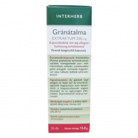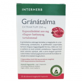 A Gránátalma EXTRAKTUM 250 mg kapszula a gránátalma sokmagú termésének kivonatát tartalmazza, amely a megújulás és a termékenység szimbóluma. A termék standardizált ellagsav tartalommal rendelkezik, amely a polifenolok csoportjába tartozik, és a gránátalma az egyik leggazdagabb forrása. A kapszula fogyasztása azok számára ajánlott, akik a piros-bogyós gyümölcsök értékes hatóanyagaival kívánják étrendjüket kiegészíteni. A termék megbízható minőségét a koncentrált extraktum, a bevizsgált alapanyag és a hazai fejlesztés garantálja.