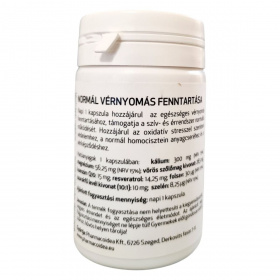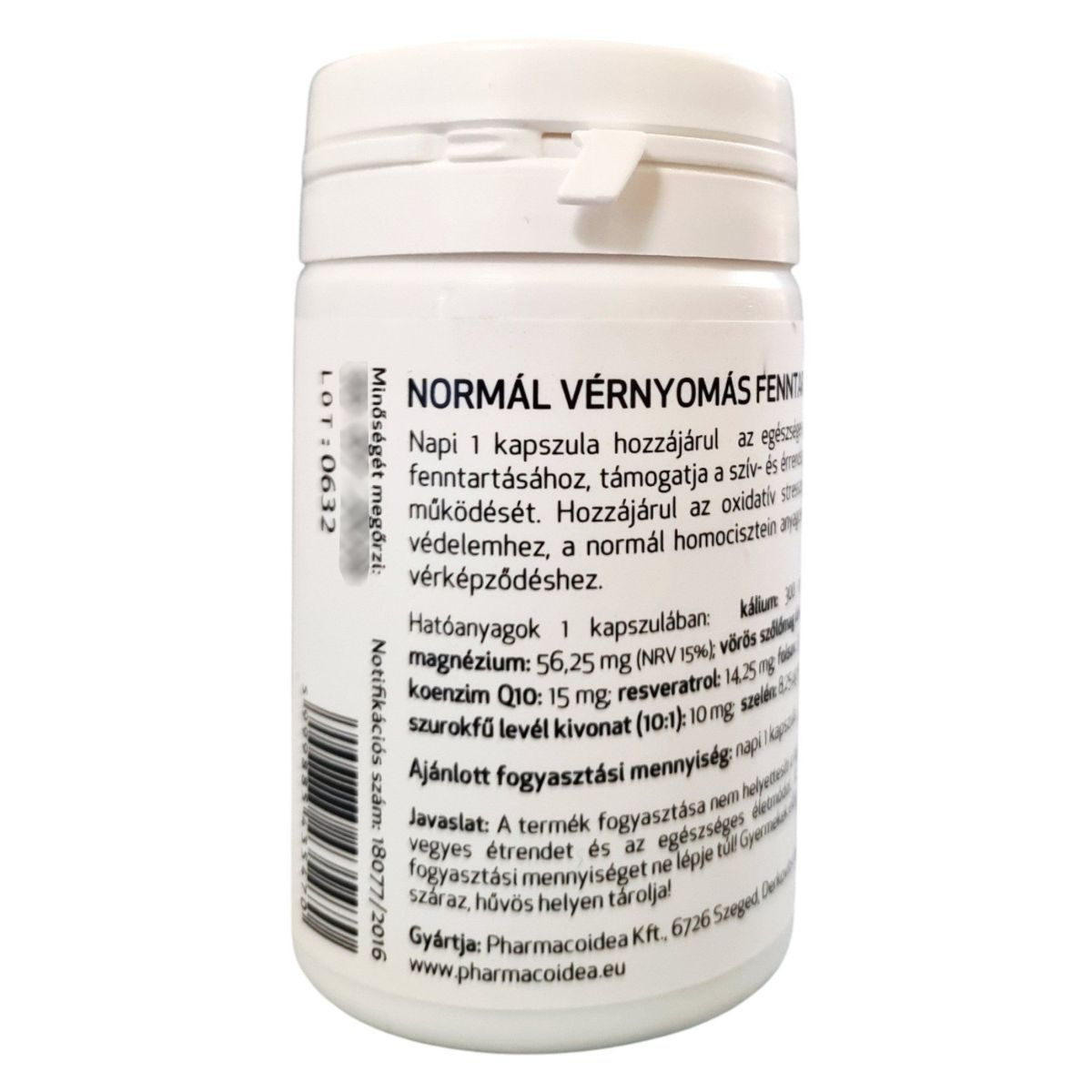 A Pharmacoidea Normál Vérnyomás Fenntartása kapszula természetes összetevőivel, mint a koenzim Q10 és a növényi kivonatok, hozzájárulhat az egészséges vérnyomás fenntartásához. A termék kálíumot, magnéziumot és szelént tartalmaz, amelyek támogathatják a szív- és érrendszer normális működését, valamint védelmet nyújthatnak az oxidatív stresszel szemben. A vörös szőlőmag kivonat és a resveratrol antioxidáns hatású lehet, míg a folsav hozzájárulhat a normál homocisztein anyagcseréhez és a vérképződéshez. A termék fogyasztása nem helyettesíti a kiegyensúlyozott étrendet és az egészséges életmódot.