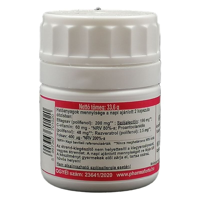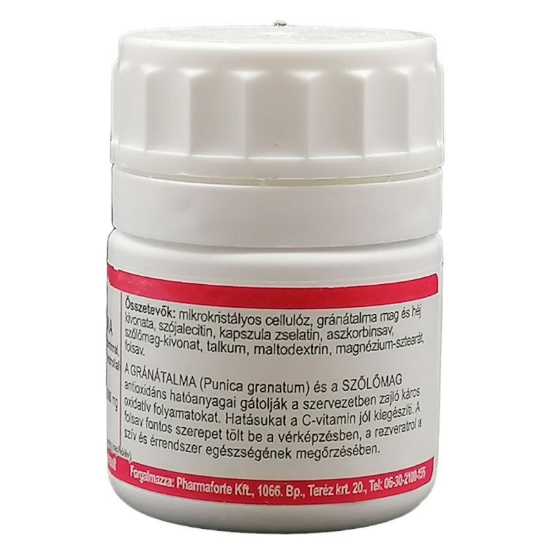 A készítmény alkalmazása javasolt a szív és érrendszer egészségének megőrzése és az egészséges kardiovaszkuláris rendszer karbantartása érdekében, szedése mindenkinek ajánlott. További alkalmazási területei: fokozott antioxidáns-, vitamin-, és nyomelem-szükséglet esetén (terhesség, szoptatás, stresszes életmód, káros környezeti hatások), fokozott szellemi és/vagy fizikai igénybevétel esetén, egyoldalú, vitaminhiányos táplálkozás esetén kiváló étrend-kiegészítő. Adagolás: felnőtteknek napi 1-2 kapszula szedése ajánlott. Kiszerelés: 60 db kapszula/ doboz. Összetevők 2 kapszulában (napi adag): gránátalma kivonat: 250 mg, szója lecitin: 560 mg, szőlőmag kivonat: 50 mg, rezveratrol: 2. 5 mg, folsav: 400 µg, C-vitamin: 60 mg. Hatóanyagok: lecitin, ellagsav (polifenol), proantocianidin (polifenol), rezveratrol, folsav. Fontos figyelmeztetések, hasznos tudnivalók: az étrend-kiegészítő nem helyettesíti a kiegyensúlyozott, vegyes étrendet és az egészséges életmódot. A napi ajánlott mennyiséget ne lépje túl. A készítményt gyermekek elől zárjuk el. Lisztérzékenyek, tejcukor érzékenyek, cukorbetegek, várandós kismamák, szoptató anyukák magas vérnyomásban szenvedők is fogyaszthatják. Regisztrációs kategória: étrend-kiegészítő.