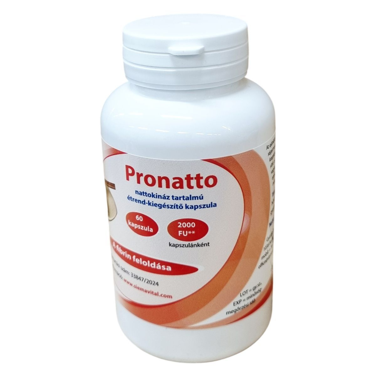 A Pronatto kapszula 60 darabos kiszerelésben kapható, és napi egy kapszula bevételével javasolt a használata. Összetevői között inulin, nattokináz enzim és vegetáriánus kapszulaanyag található, melyek együttese támogathatja a szervezetet a fibrin megfelelő lebontásában. A kapszula ezáltal hozzájárulhat az érrendszer egészségéhez, feltéve, hogy a termék rendszeres használata mellett kiegyensúlyozott és vegyes étrendet tartanak be, valamint egészséges életmódot folytatnak. A termék fogyasztás előtt tárolása legyen száraz és hűvös helyen, gyermekek elől elzárva. A nyilvántartási szám garantálja a termék hivatalos engedélyét. Az étrend-kiegészítő nem alkalmas a változatos étrend és az egészséges életmód helyettesítésére. Felhasználói körét illetően nem ajánlott 18 év alattiaknak, terhes és szoptató nőknek, illetve véralvadási rendellenességgel küzdőknek vagy véralvadásgátló gyógyszert szedőknek, akiknek előzetesen orvossal kell konzultálniuk.