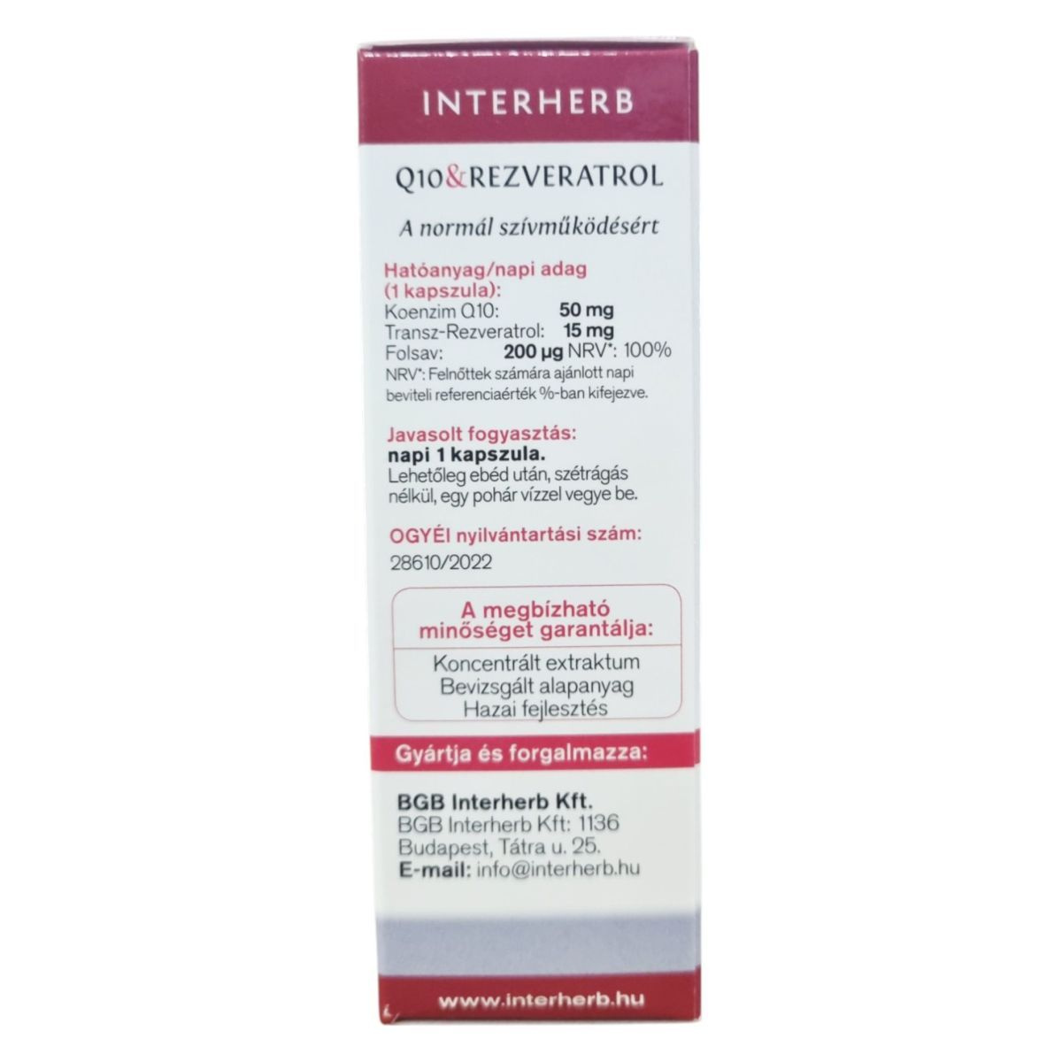 Az INTERHERB Q10 & REZVERATROL étrend-kiegészítő kapszula a normál szívműködés támogatására készült. A koenzim Q10 az energiatermelő folyamatok katalizátora, amelynek mennyisége az életkor előrehaladtával csökkenhet, így kiegészítése 40 év fölött, fokozott fizikai és szellemi igénybevétel esetén, valamint idős korban lehet indokolt. A transz-rezveratrol egy polifenolos vegyület, amelyet a kékszőlő fajták, mogyorófélék és keserűfűfélék tartalmaznak, és hozzájárulhat a normál szívműködés fenntartásához. A folsav szerepet játszhat a fáradtság és kifáradás csökkentésében, valamint az immunrendszer normál működésében. A termék koncentrált extraktumokat és bevizsgált alapanyagokat tartalmaz, hazai fejlesztés eredménye.