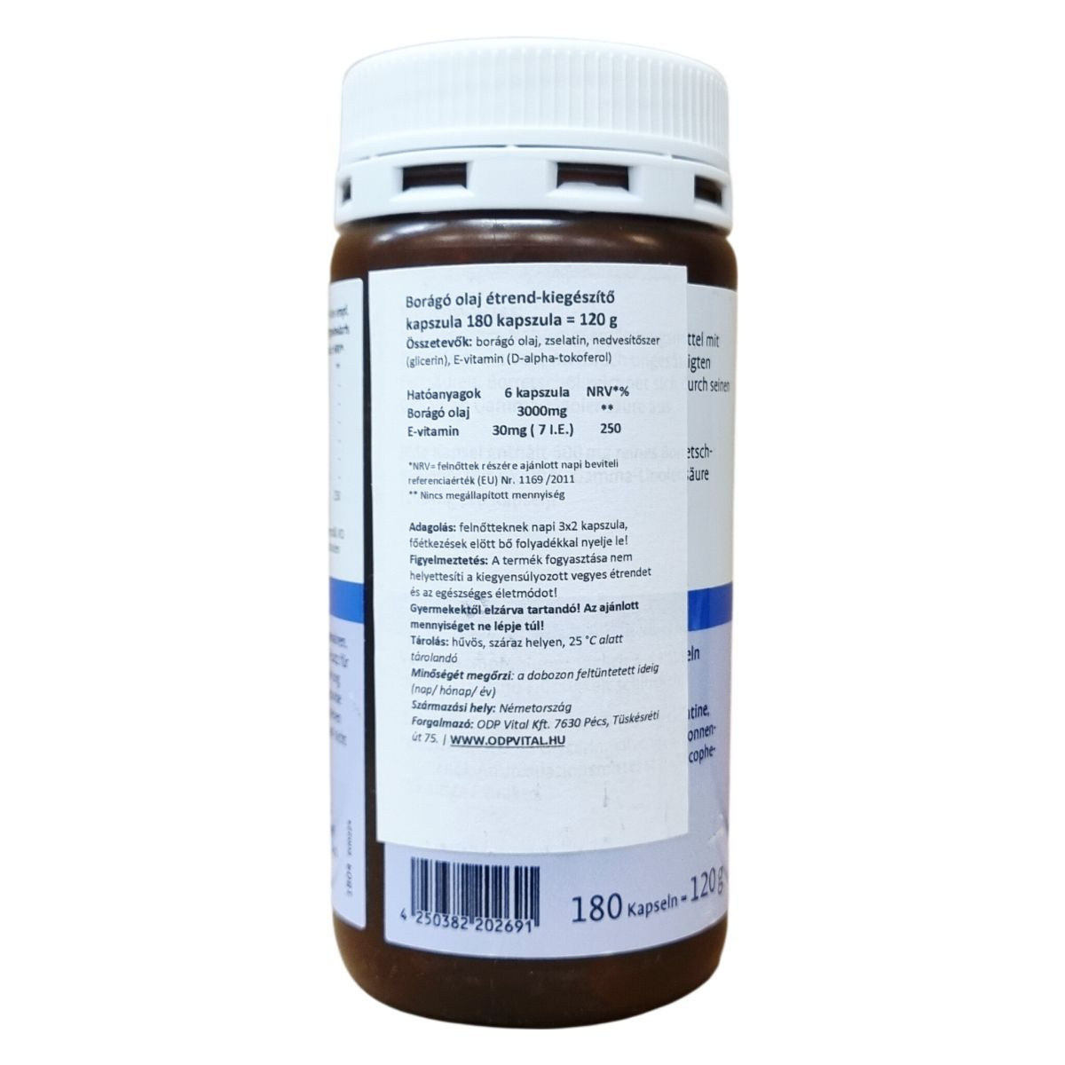 A borágó olaj kapszula egy étrend-kiegészítő, amelyet gamma-linolénsavval és természetes E-vitaminnal gazdagítottak. A kapszula 500 mg borágó olajat tartalmaz kapszulánként, és 180 darabot tartalmazó kiszerelésben érhető el. A termék németországi gyártású, és felhasználási javaslat szerint felnőtteknek napi hatszoros bevitelével javasolt fogyasztani bő folyadékkal, főétkezések előtt. A borágó olaj fő komponense a többszörösen telítetlen zsírsavak közé tartozó gamma-linolénsav. A termék természetes E-vitaminnal egészíti ki az összetételét, amely antioxidáns tulajdonságokkal bírhat. Tárolását fénytől védve, száraz, 25 °C alatti hőmérsékleten javasolt végezni. A készítmény nem helyettesíti a változatos, kiegyensúlyozott étrendet és az egészséges életmódot, gyermekektől elzárva kell tartani, és az ajánlott napi mennyiséget nem szabad túllépni.