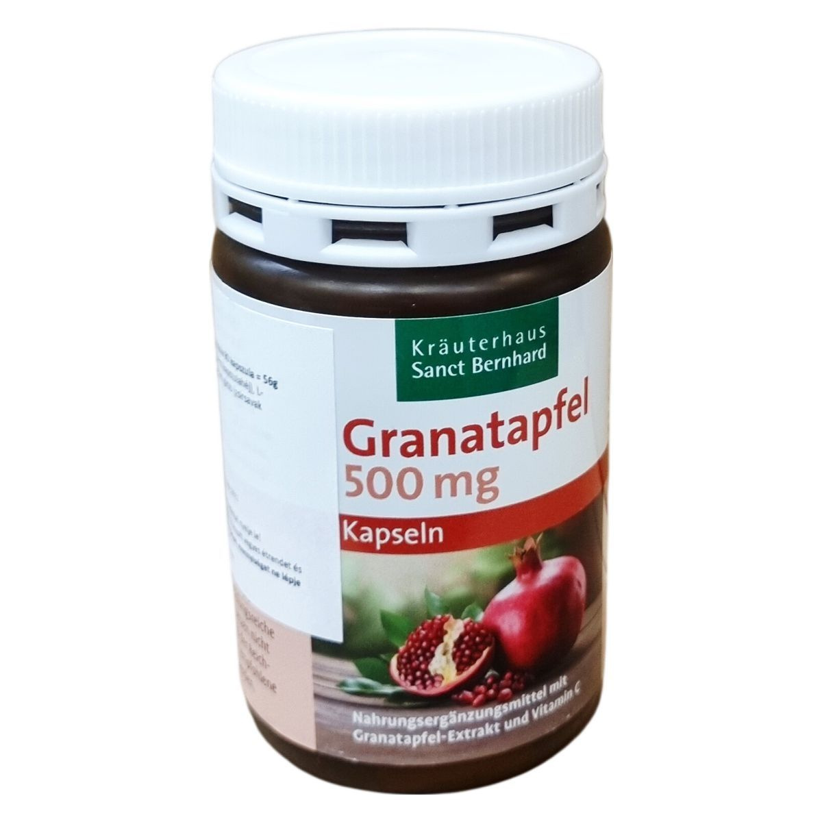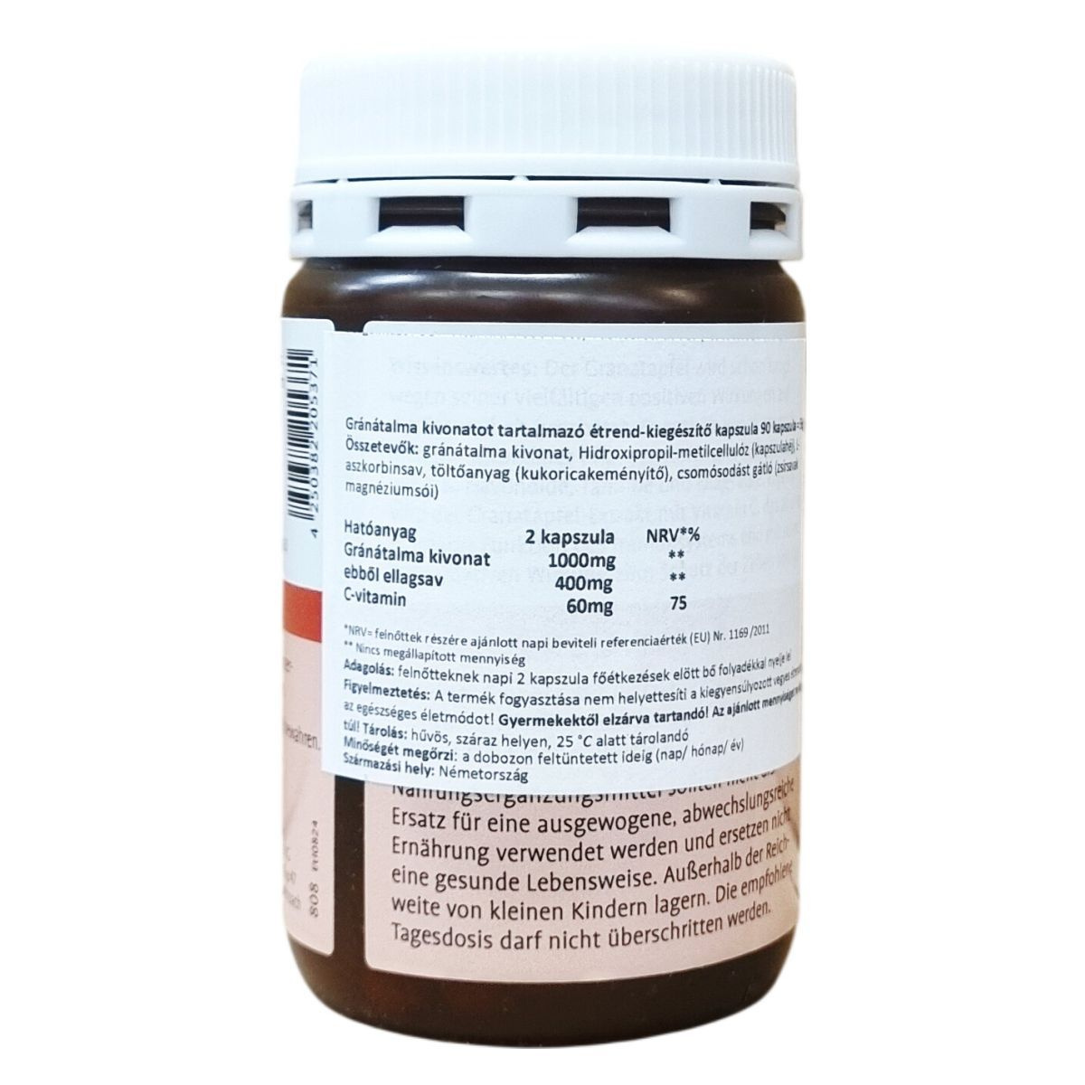 Gránátalma-kivonatot és C-vitamint tartalmazó étrend-kiegészítő. Egy kapszula 500 mg gránátalma-kivonatot tartalmaz, amelyből 200 mg ellagsav, valamint 30 mg C-vitamin. A C-vitamin hozzájárul a napi referenciaérték 75%-ához 2 kapszula esetén. A tápanyag-referenciaérték az 1169/2011/EU rendelet alapján került meghatározásra. 90 kapszulát tartalmazó kiszerelés. Származási hely: Németország.