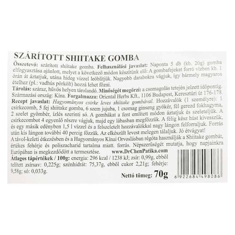 A shiitake gomba szárítása során megőrzi karakteres ízét, így bármikor könnyedén felhasználható. Az áztatás után felhasználható levesekben, pörköltekben, rizottókban és sok más fogásban. Az íze rendkívül gazdag, és jól illik a zöldségekhez és a húsokhoz is, így sokoldalúan alkalmazható az ételekben.