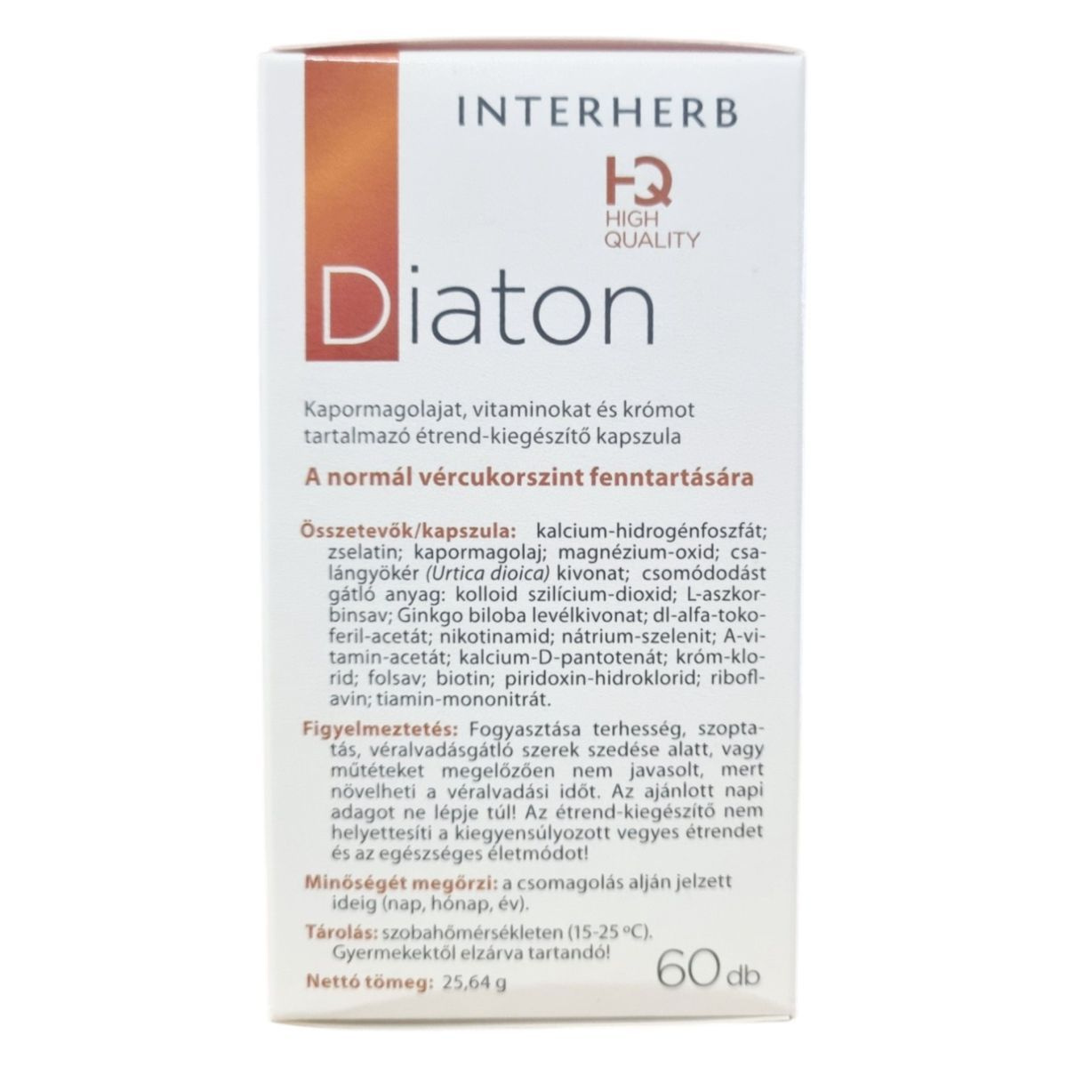 Az INTERHERB HQ HIGH QUALITY Diaton egy komplex étrend-kiegészítő, amely kapormagolajat, vitaminokat, ásványi anyagokat és gyógynövény-kivonatokat tartalmaz. A termék króm tartalma hozzájárulhat a normál vércukorszint fenntartásához, míg a B6-vitamin részt vehet a glikogén anyagcserében. A termék összetevői között megtalálható a csalángyökér és a Ginkgo biloba levélkivonat is. A termék fogyasztása nem javasolt bizonyos egészségügyi állapotok esetén, és fontos, hogy az ajánlott napi adagot ne lépjük túl.