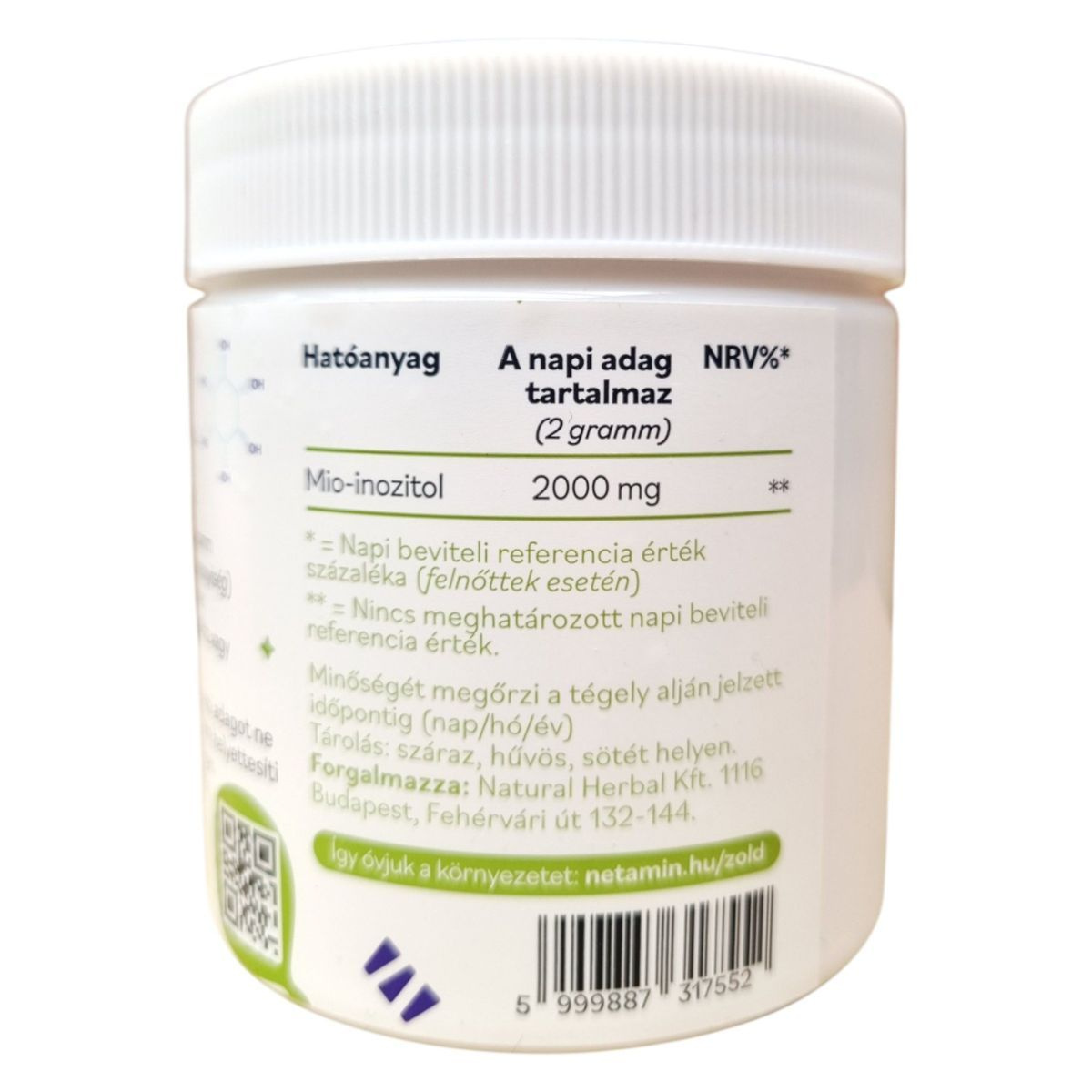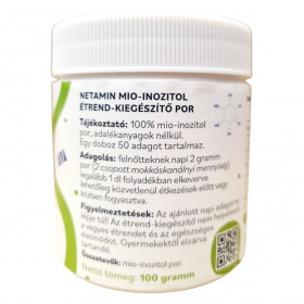 A Netamin Mio-inozitol por 100% tisztaságú mio-inozitolt tartalmaz, adalékanyagok nélkül. A termék 50 adagot biztosít, és segíthet a szervezet inozitol-szükségletének kielégítésében.