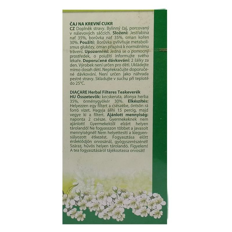 Diabetikus diéták ideje alatt is javasolható. Gyermekeknek nem javasolt. A tea fogyasztásának megkezdése előtt egyeztessen kezelőorvosával. Összetevők: kecskeruta, áfonya, örménygyökér