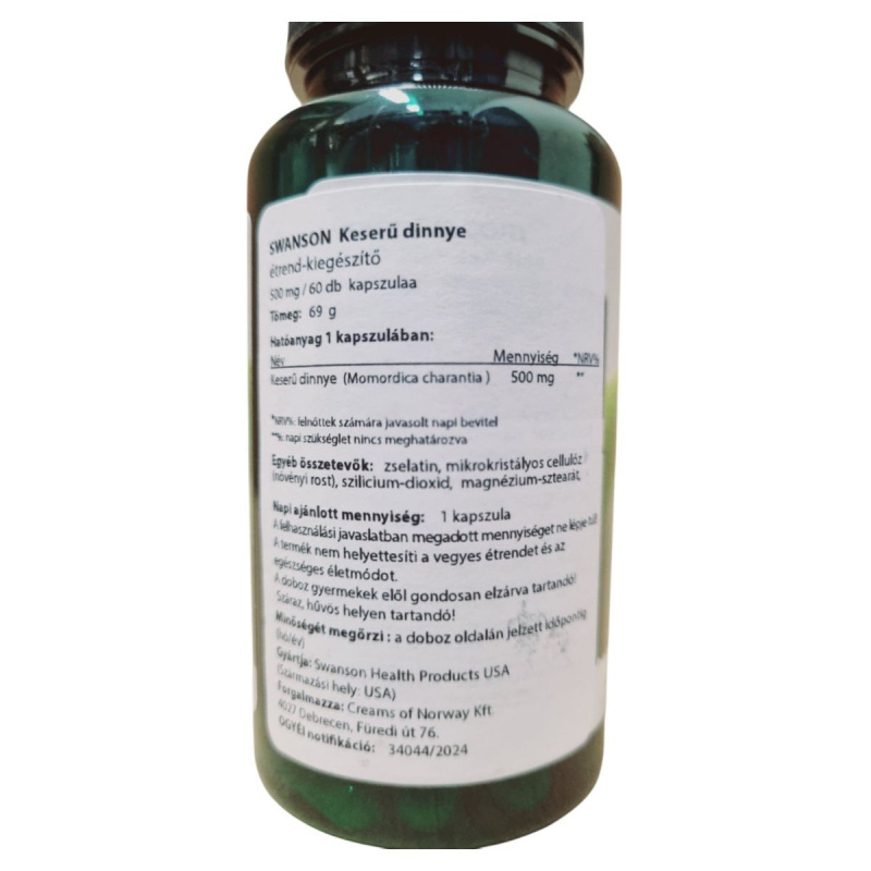 A Swanson Keserű dinnye étrend-kiegészítő kapszula formájában érhető el, mely 500 mg keserű dinnye kivonatot tartalmaz. A keserű dinnye, más néven Momordica charantia, egy hagyományosan használt növény, amely hozzájárulhat az egészséges életmód támogatásához. A termék zselatin kapszulában kerül forgalomba, és egyéb összetevői közé tartozik a mikrokristályos cellulóz, a szilícium-dioxid és a magnézium-sztearát. A kapszulák napi ajánlott mennyisége egy darab, amelyet nem szabad túllépni. A termék nem helyettesíti a vegyes étrendet és az egészséges életmódot, és fontos, hogy gyermekek elől elzárva tartsuk. A Swanson Health Products által gyártott terméket a Creams of Norway Kft. forgalmazza Magyarországon.