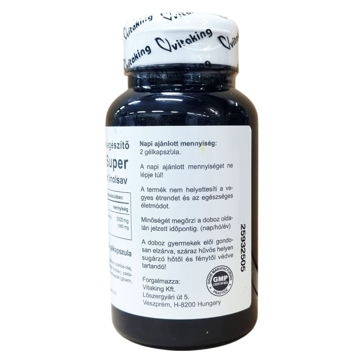A CLA Super étrend-kiegészítő sáfrányos szeklice-olajból készült, amely jelentős mennyiségben tartalmaz konjugált linolsavat (CLA). A csomagolás 60 gélkapszulát tartalmaz. A termék minőségét a doboz oldalán jelzett időpontig őrzi meg. Az ajánlott napi fogyasztás 2 kapszula, melyet nem szabad túllépni. A készítményt száraz, hűvös helyen, gyermekektől elzárva szükséges tárolni. A termék nem helyettesíti a kiegyensúlyozott étrendet és az egészséges életmódot. A gyártó a Vitaking Kft., melynek címe Veszprém, Magyarország.