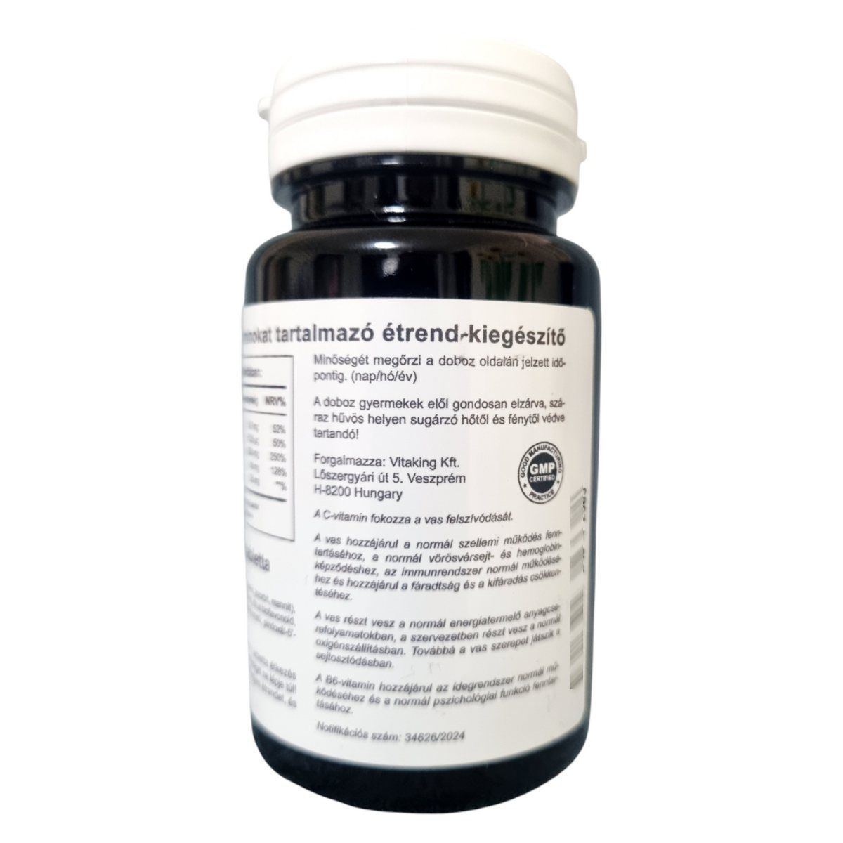 A Vitaking Iron All tabletta komplex étrend-kiegészítő, amely szerves, kelátolt vasat tartalmaz a jobb hasznosulás érdekében. A készítmény C-vitaminnal és citrus bioflavonoidokkal kiegészítve segítheti a vas felszívódását, míg a B6- és B12-vitamin hozzájárulhat a normál energiatermelő anyagcsere-folyamatokhoz, a vörösvérsejt-képződéshez és az idegrendszer megfelelő működéséhez. A termék alkalmazása különösen azok számára lehet hasznos, akik fokozott vasbevitelre szorulnak, például vérveszteség, vegetáriánus étrend vagy egyéb okok miatt. A tabletta gondosan összeállított összetevői révén komplex támogatást nyújthat a szervezet számára.