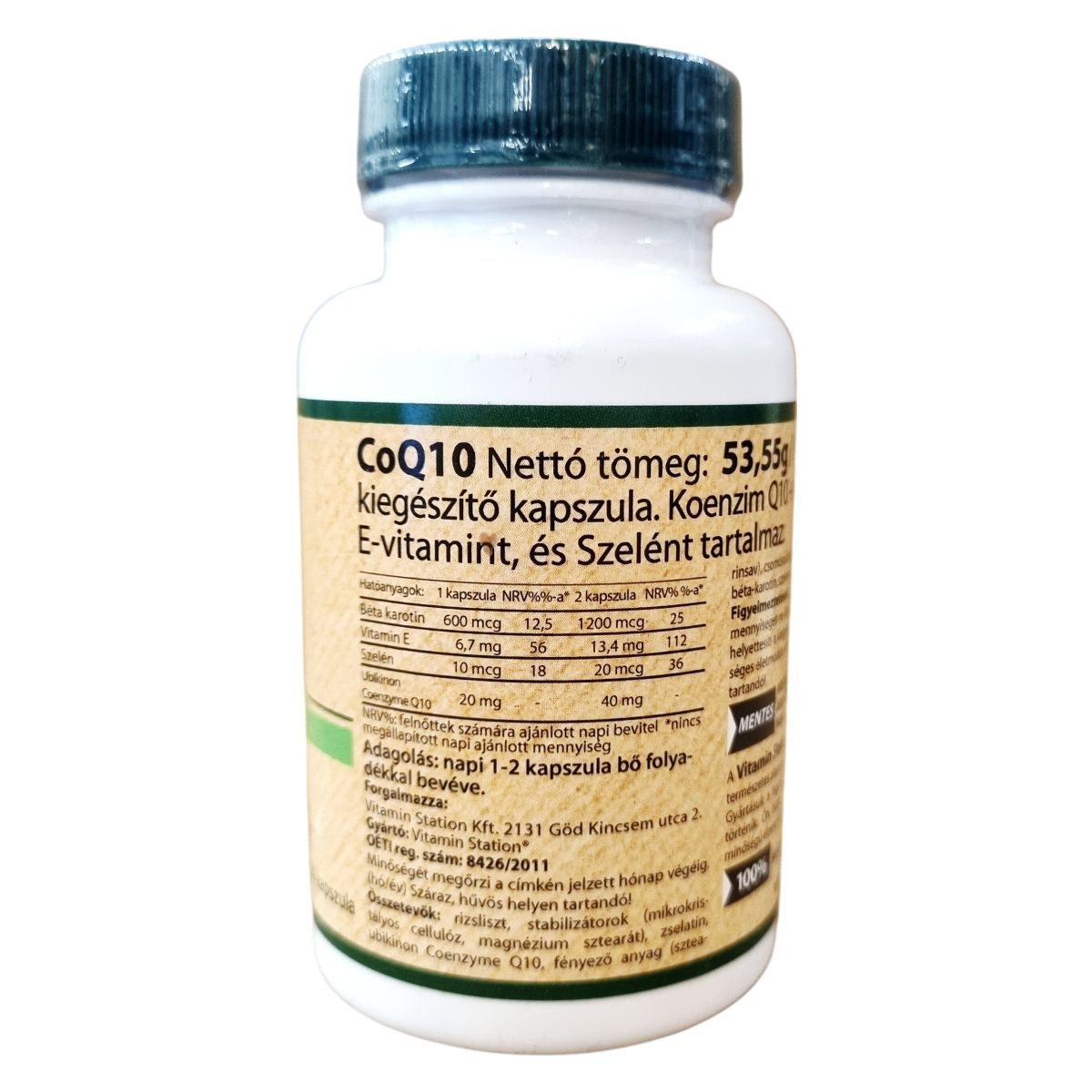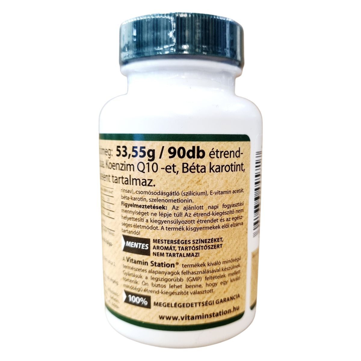 A Vitamin Station Co Q10 kapszula koenzim Q10, E-vitamin, béta-karotin és szelén tartalmú étrend-kiegészítő. Mesterséges színezéket, aromát és tartósítószert nem tartalmaz. A termék kiváló minőségű alapanyagok felhasználásával, szigorú gyártási feltételek mellett készül, 100% megelégedettségi garanciával.