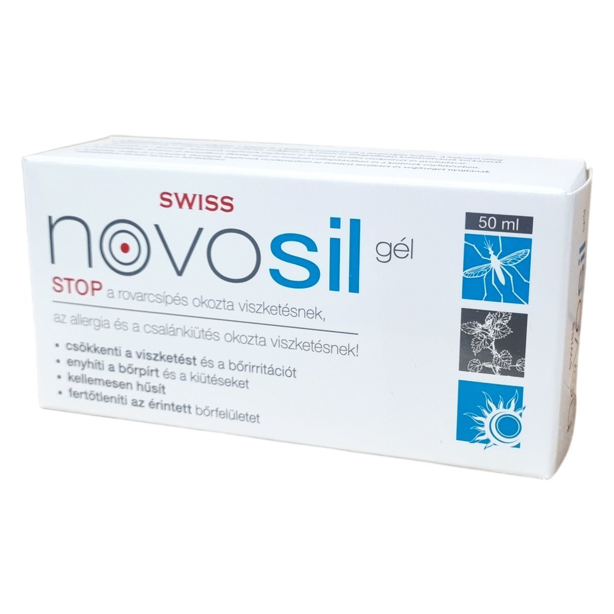 A Novosil gél olyan orvostechnikai eszköz, amely hidrogel rétegként hűsíti és védi az irritált bőrfelületet, csökkentve a viszketést, bőrpírt és a kiütéseket, továbbá segít megelőzni a fertőzések és bőrgyulladások kialakulását. A benne található gyógynövény kivonatok és illóolajok, mint az indiai tömjénfa, keserűfű, szemvidítófű, mentol, bazsalikom, zsálya és cickafark természetes módon enyhítik a bőrirritációt, csillapítják az allergiás és atópiás bőrtüneteket, valamint mikrobiális tisztán tartják az érintett bőrfelületet.
