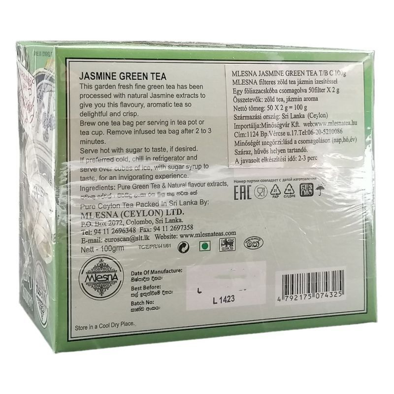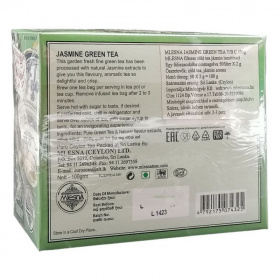 Filteres zöld tea aromazáró fóliazacskóba csomagolva. Összetevők: zöld tea, jázmin aroma.