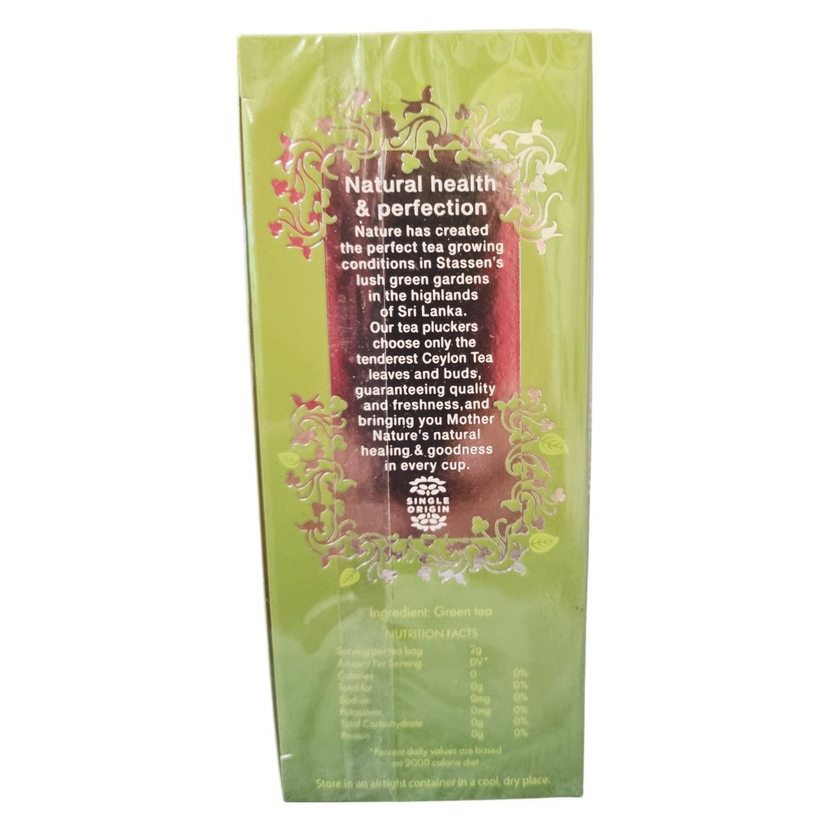 A Stassen Pure Ceylon zöld tea olyan környezetből származik, ahol a teanövények ideális klimatikus feltételek mellett fejlődnek. A levelek gyengéd, természetes aromát hordoznak, amely egy könnyű, letisztult teaélményt eredményezhet. A zöld tea jellegzetessége az egyszerű, tiszta összetétel és az a friss íz, amely miatt sokan a mindennapi teázás részeként fogyasztják. A tea nulla kalóriát tartalmaz, így bármikor beilleszthető egy könnyed, kiegyensúlyozott életmódba. A single origin jelölés a tealevelek egységes, egy termőterületről származó minőségére utal. A ceyloni termőterületek különösen kedvezőek a teanövény számára, ezért a levelek gazdag, tiszta karaktert hordoznak. A zöld tea természetes összetevői közé tartoznak a polifenolok és antioxidánsok, amelyek a tea jellegzetes ízét és könnyedségét adják.