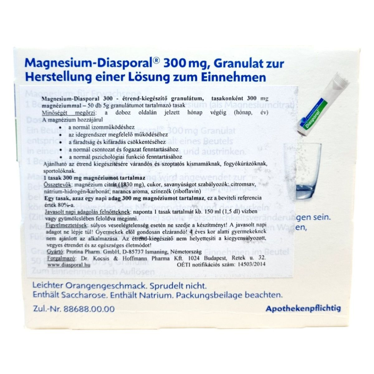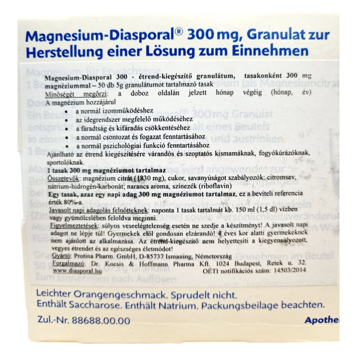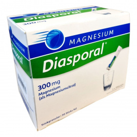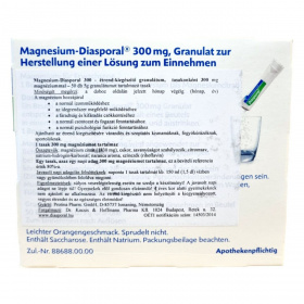 A Magnesium Diasporal 300 mg egy étrend-kiegészítő granulátum, amelyet a normál izomműködés, az idegrendszer megfelelő működése, valamint a fáradtság és kifáradás csökkentése érdekében fejlesztettek ki. A termék 50 db 5g granulátumot tartalmazó tasakot tartalmaz, melyek mindegyike 300 mg magnéziumot biztosít. A magnézium citrát formájában van jelen, és a napi beviteli referencia érték 80%-át fedezi. A termék narancs ízesítésű, nem pezseg, és szacharózt, valamint nátriumot tartalmaz. Ajánlható várandós és szoptatós kismamáknak, fogyókúrázóknak és sportolóknak is.