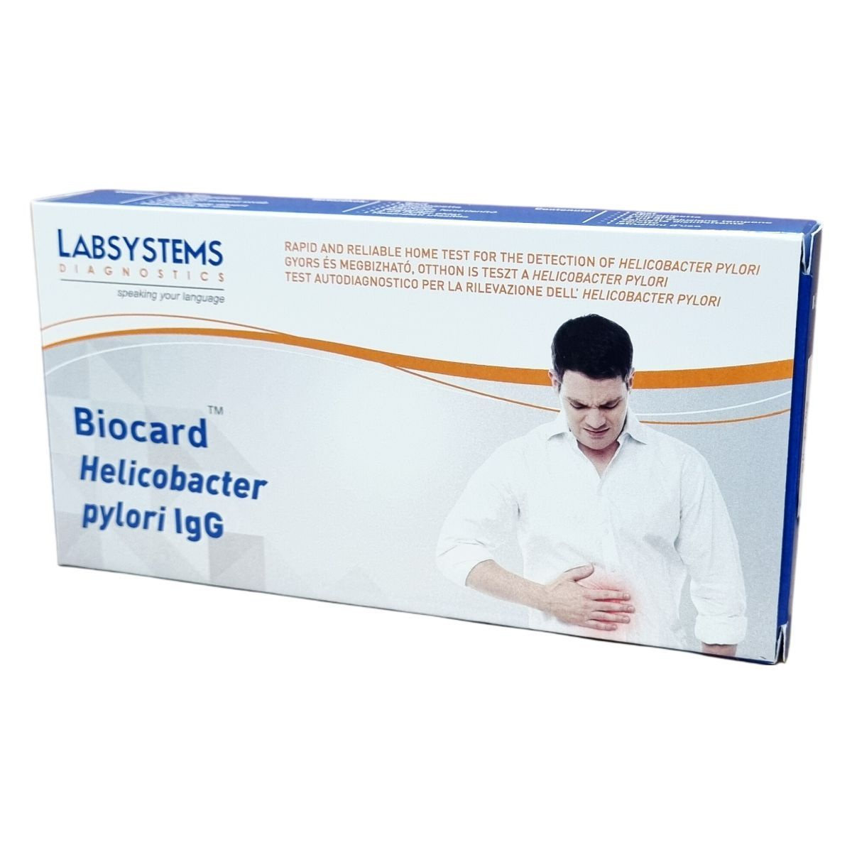 A Biocard™ Helicobacter pylori IgG teszt egy gyorsan elvégezhető otthoni diagnosztikai eszköz, amely segítségével a gastroduodenalis megbetegedésekhez köthető Helicobacter pylori antitestek jelenlétét lehet kimutatni. A csomag tartalmaz egy tesztkészletet, micropipettát, lándzsát, alkoholos fertőtlenítőt, ragasztószalagot, valamint egy 1,2 ml pufferoldatot és használati utasítást. A mintavétel ujjbegyből történik, a teszt eredménye pozitív vagy negatív lehet, a használat kizárólag a mellékelt útmutató szerint ajánlott. A termék a laboratóriumi diagnosztikai eszközök közé tartozik és CE jelzéssel rendelkezik.