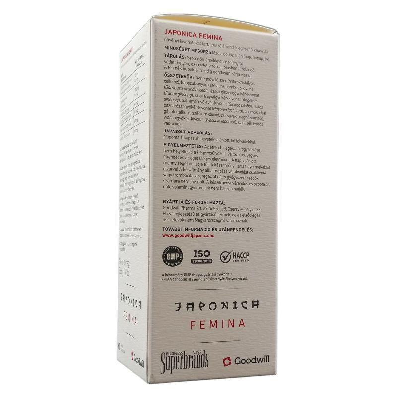 Japonica Femina: hormonmentes, naponta 1 kapszula. 1 doboz 2 havi adagot biztosít.