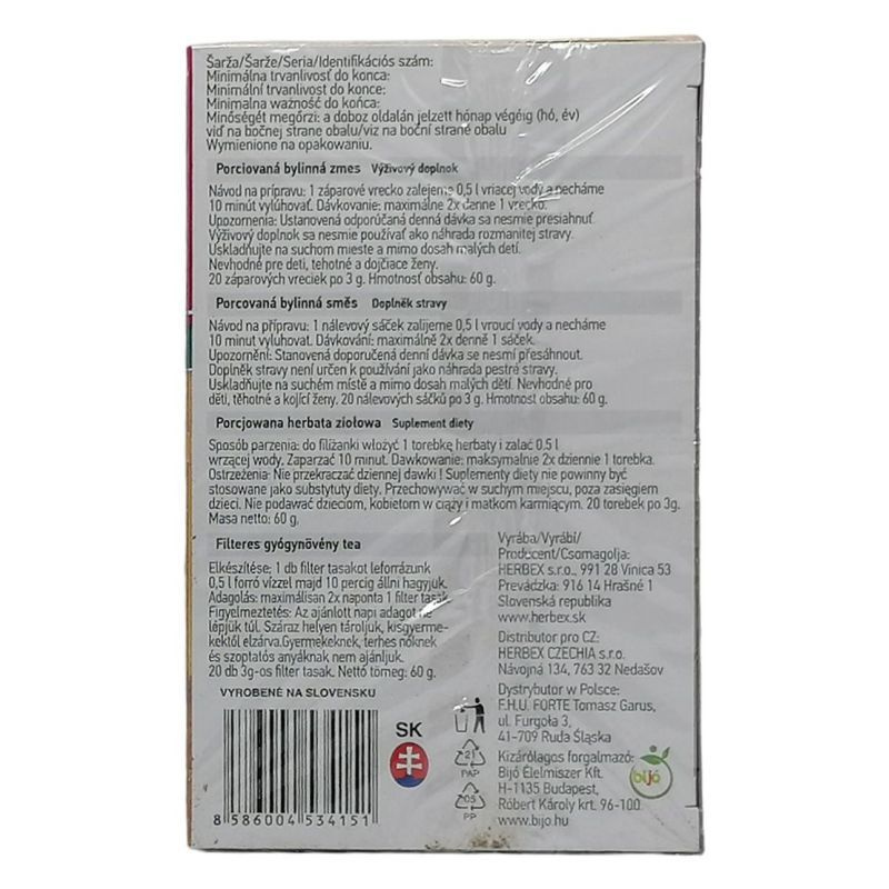 Az orbáncfű segít fenntartani a jó közérzetet és a pozitív hangulatot. Összetevők: lóhere virág, palástfű levél, cickafarkfű levél, kerti kakukkfű levél, orbáncfű levél. Nettó tömeg: 60 g, 20 db 3 g-os filter tasak. Elkészítése: 1 db filter tasakot leforrázunk 0,5 l vízzel,majd 10 percig állni hagyjuk.