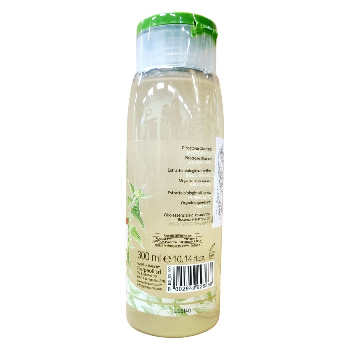 Piroctone Olamine (korpásodás ellenes), organikus csalán kivonat (kiegyensúlyozó), organikus zsálya kivonat (tisztító), rozmaring illóolaj (tisztító terápiás hatású)