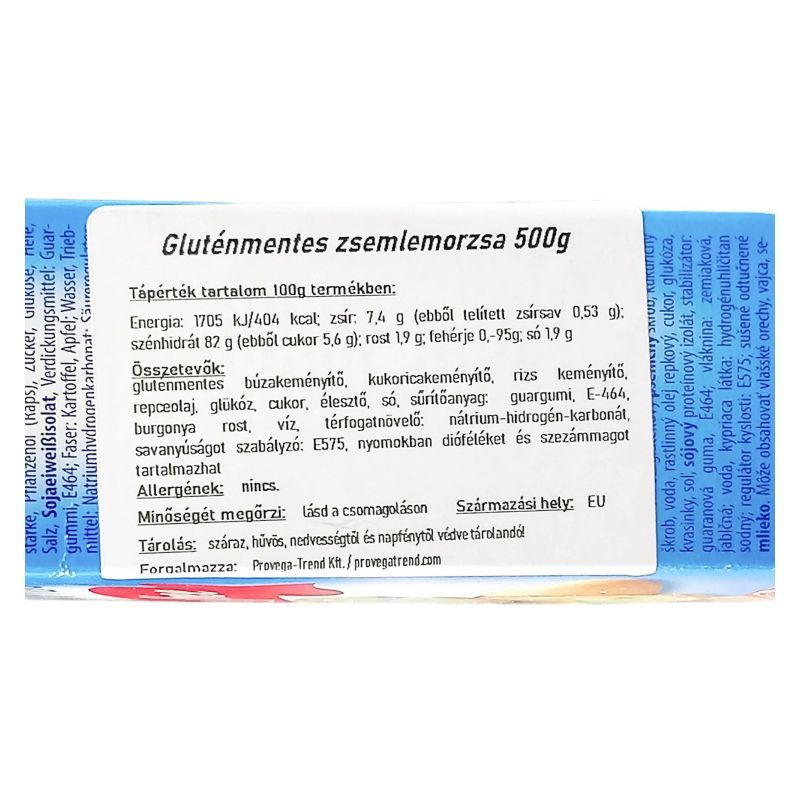 Gluténmentes zsemlemorzsa 500g, amely ideális panírozáshoz, ropogós állagot és tiszta ízt biztosít allergénmentes diétában.