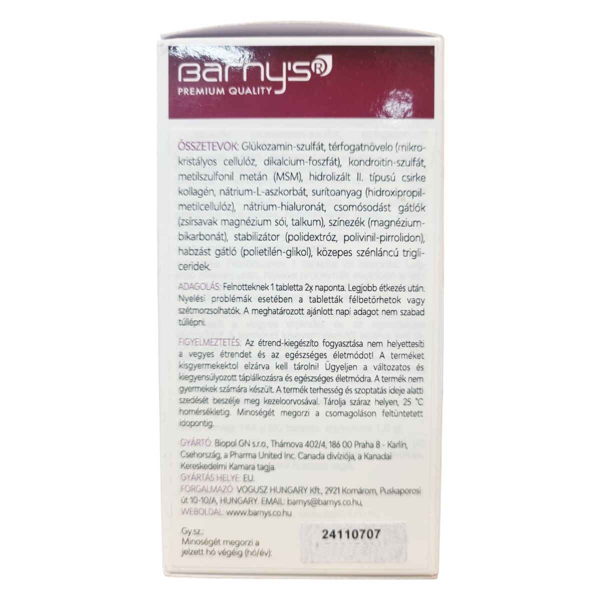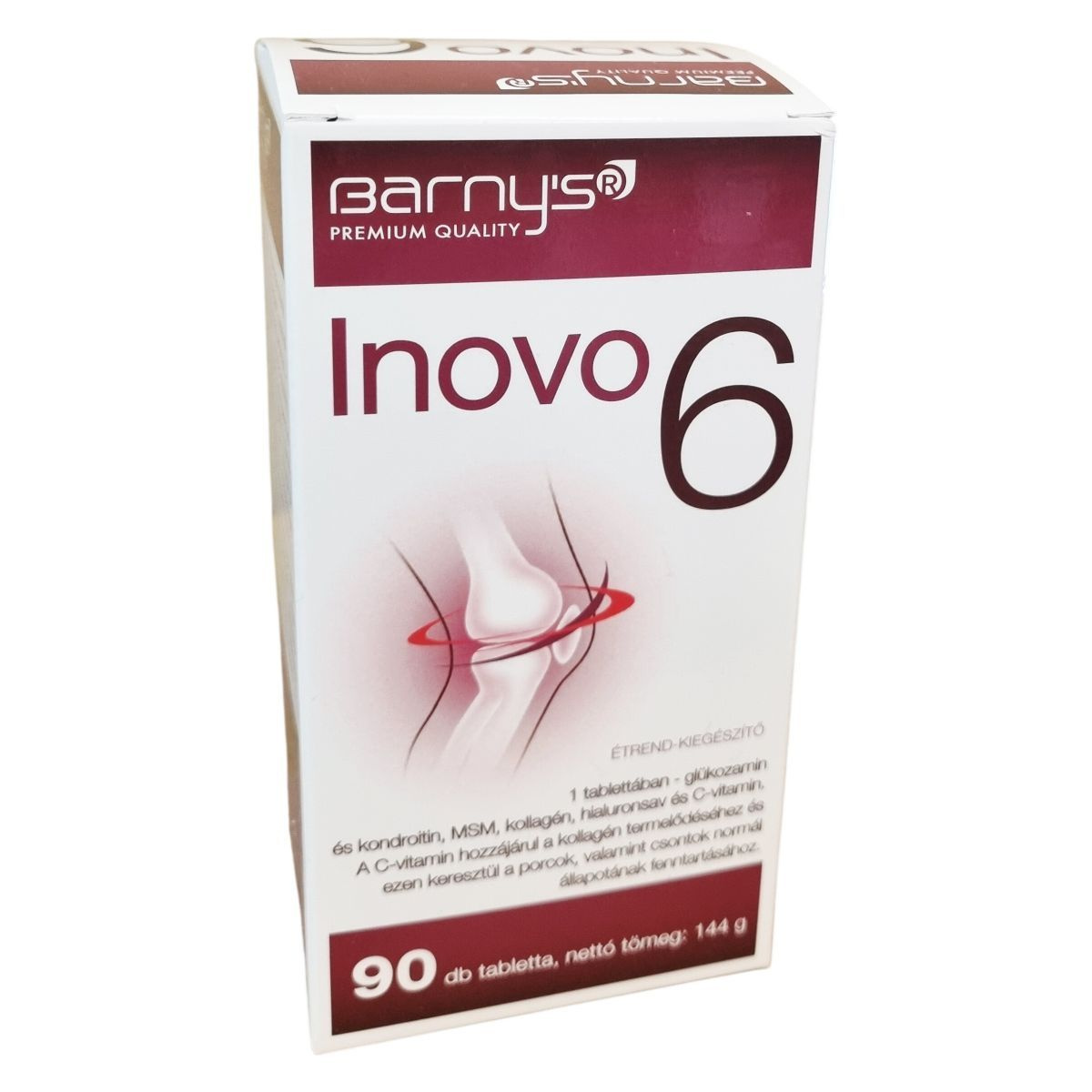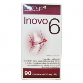 A barny's® Inovo 6 kombinált növényi és állati eredetű étrend-kiegészítő, amely glükozamin-szulfátot, kondroitin-szulfátot, MSM-t, II. típusú kollagént, hialuronsavat és C-vitamint tartalmaz. A C-vitamin hozzájárulhat a kollagén termelődéséhez, ami támogatja a porcok és csontok normál állapotának fenntartását. A termék összetevői természetes módon megtalálhatók az ízületekben, kötőszövetekben és porcokban. A termék gyártása az Európai Unió területén történik, és a biopol GN s.r.o. gyártja, míg a forgalmazást a VOGUSZ HUNGARY Kft. látja el. A tabletták adagolása egyszerű, a tabletták szükség esetén könnyen félbe törhetők vagy szétmorzsolhatók a nyelési problémák megkönnyítésére. A termék használata mellett ajánlott a változatos és kiegyensúlyozott étrend és egészséges életmód fenntartása.