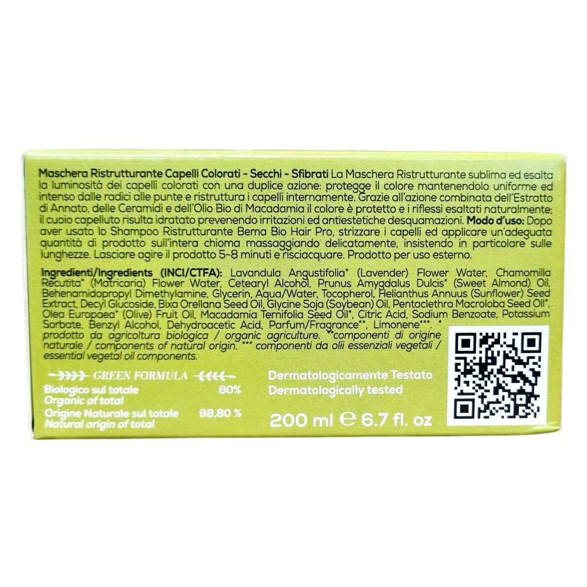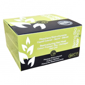 A BemaBio Hair Pro Struktúrajavító Hajpakolás kettős hatású formula, amely védi a színezett hajat, megőrizve annak fényét és színének intenzitását egységesen a haj teljes hosszában. Az annatto kivonat, ceramidok és bio makadámiaolaj kombinációja ápolja és hidratálja a fejbőrt, megelőzve az irritációt és a hámlást. A termék 80%-ban bioösszetevőkből készül, természetes eredetű összetevőinek aránya pedig 98,8%. Az energiaellátás megújuló forrásokból származik. Használata után a haj puha, fényes és egészséges megjelenésű lesz, miközben megőrzi a festett haj színének tartósságát és élénkségét.