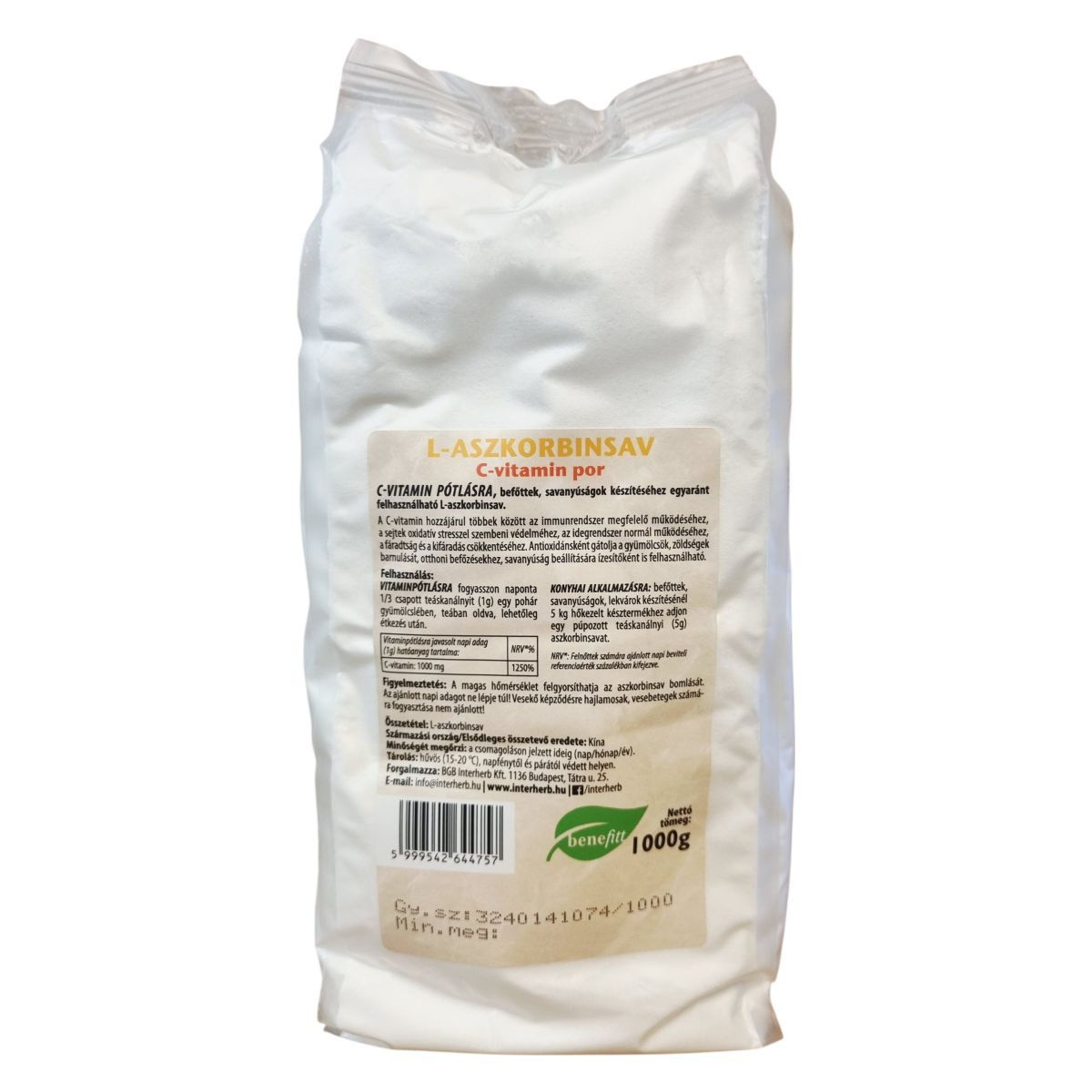 Az L-aszkorbinsav egy tiszta C-vitamin por, amely hozzájárulhat az immunrendszer normál működéséhez, az oxidatív stressz csökkentéséhez, valamint az idegrendszer és a fáradtság mérsékléséhez. Antioxidáns tulajdonságai révén gátolhatja a gyümölcsök és zöldségek barnulását, így alkalmas otthoni befőzések és savanyúságok ízesítésére, minőségmegőrzésére. A termék Kínában készül, és 1000 grammos kiszerelésben kerül forgalomba. A csomagoláson jelzett időpontig megőrzi minőségét.