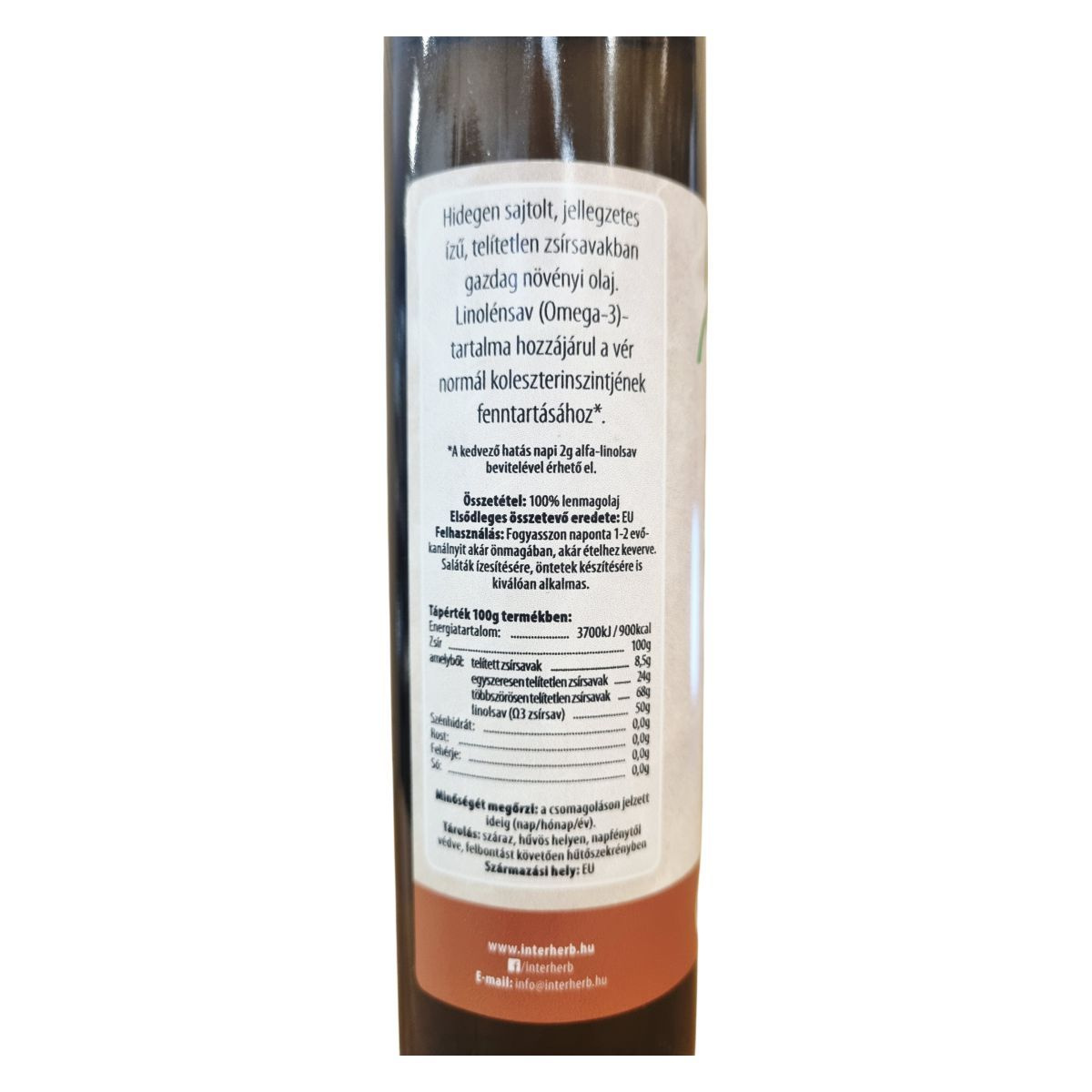 Ez a hidegen sajtolt lenmagolaj jellegzetes ízű, és gazdag telítetlen zsírsavakban, különösen alfa-linolénsavban (Omega-3). Ez a hatóanyag hozzájárul a vér normál koleszterinszintjének fenntartásához, a kedvező hatás napi 2 g alfa-linolénsav bevitelével érhető el. Az olaj 100%-ban lenmagból származik, és elsődleges összetevője az Európai Unióból származik.