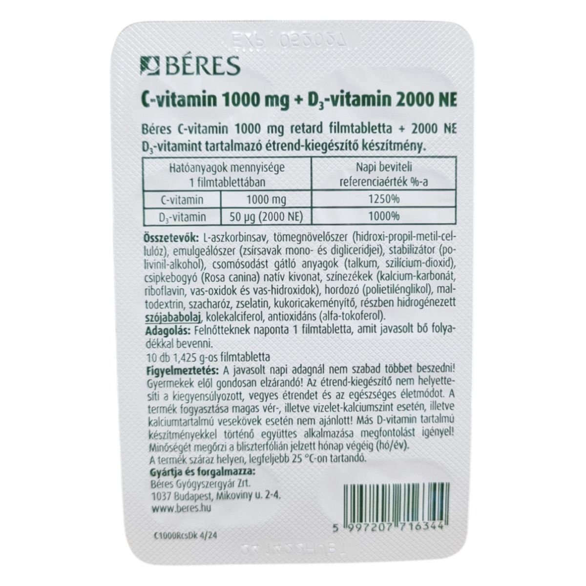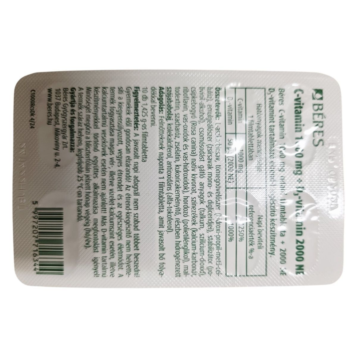 A Béres C-vitamin 1000 mg + D₃-vitamin 2000 NE étrend-kiegészítő filmtabletta formájában kapható, és a C-vitamin antioxidáns hatásával, valamint a D₃-vitamin csontok egészségére gyakorolt potenciális hatásával támogathatja az immunrendszer normál működését. A termék összetevői között megtalálható a csipkebogyó natív kivonata, valamint különböző stabilizátorok és antioxidánsok. A termék fogyasztása nem ajánlott bizonyos egészségügyi állapotok esetén, és fontos, hogy a javasolt napi adagot ne lépjük túl. A Béres Gyógyszergyár Zrt. által gyártott termék száraz helyen, legfeljebb 25 °C-on tárolandó.