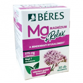 A Béres Mg Magnézium +Relax egy filmtabletta formájában kapható étrend-kiegészítő, amely magnéziumot, B-vitaminokat (B5, B6, B7, B9) és Valeriana officinalis (macskagyökér) száraz kivonatot tartalmaz. A macskagyökér hozzájárulhat a mentális egészség fenntartásához, különösen feszült, stresszes és felfokozott életmód esetén, valamint támogathatja a normál alvás fenntartását. A magnézium és B-vitaminok hozzájárulhatnak a fáradtság és kifáradás csökkentéséhez, valamint az idegrendszer normál működéséhez. A készítmény ajánlott kiegyensúlyozatlan táplálkozás, fokozott fizikai megterhelés és jelentős szellemi igénybevétel esetén. A filmtabletták 1,68 g-osak, és a termék 30 darabos kiszerelésben érhető el.