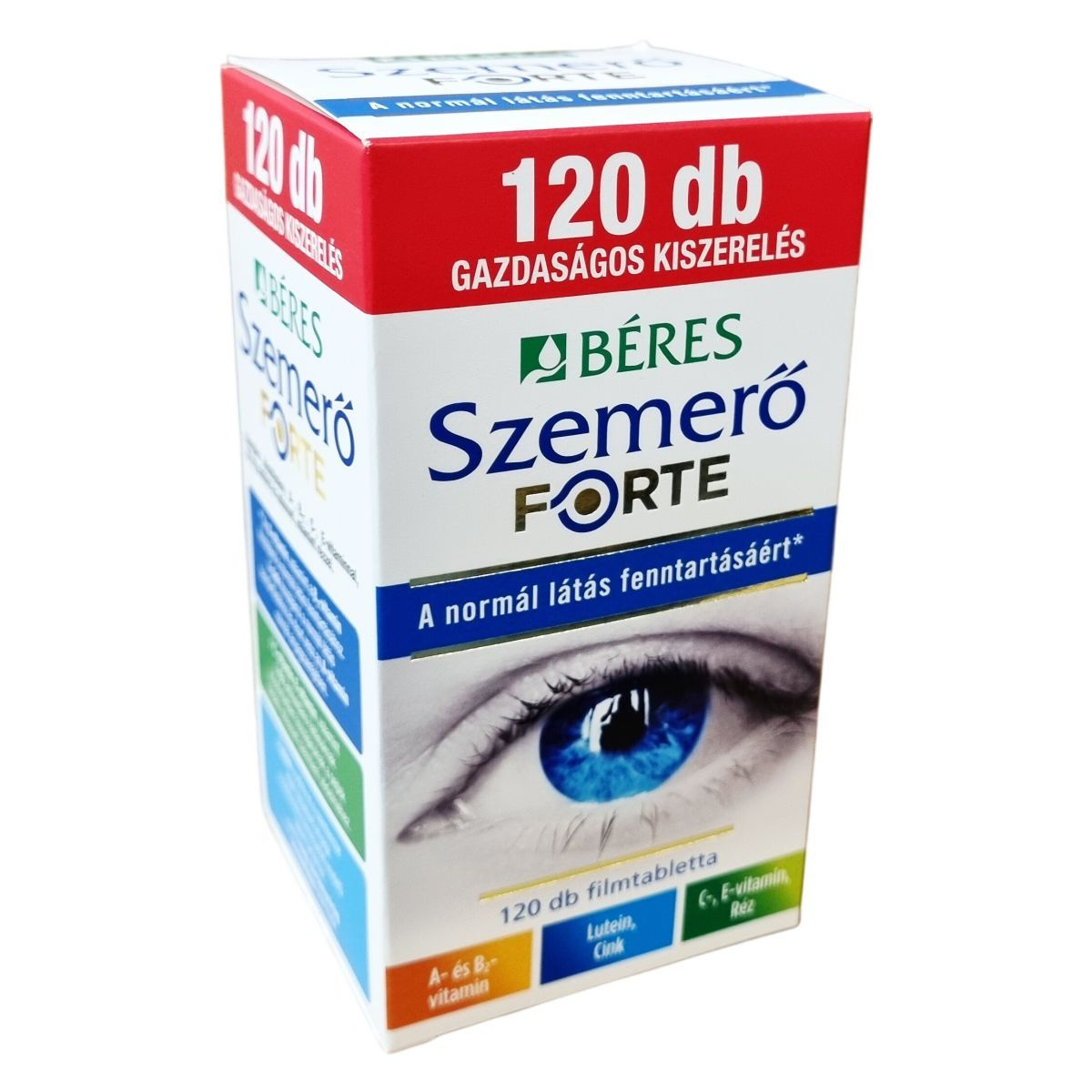 A Béres Szemerő FORTE filmtabletta vitaminokat, ásványi anyagokat és luteint tartalmazó komplex étrend-kiegészítő készítmény, amelyben az A-vitamin és a B2-vitamin hozzájárulhat a normál látás fenntartásához. A cink szintén hozzájárulhat a normál látás fenntartásához és részt vehet az A-vitamin normál anyagcseréjében. A C- és E-vitamin, valamint a réz antioxidáns hatásuk révén támogathatják a sejtek oxidatív stresszel szembeni védelmét. A készítmény természetes eredetű luteint tartalmaz, amely a retina és a szemlencse egyik fontos összetevője, és nagy bársonyvirág kivonatából származik. A termék különösen javasolt a megfelelő látás fenntartásáért, rossz világítási viszonyok között dolgozóknak, valamint gyakori képernyőhasználat mellett. A filmtabletták gazdaságos kiszerelésben, 120 darabos csomagban érhetők el.