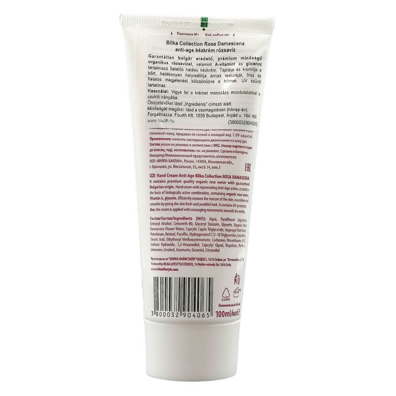 Fiatalító öregedésgátló hatású kézkrém, biológiailag aktív kombináció alapján, szerves rózsavizet, A-vitamint, glicerint tartalmaz.