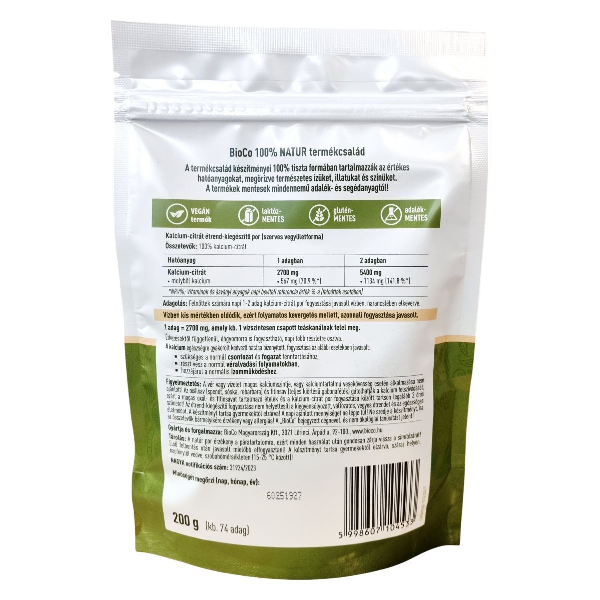 A BioCo 100% NATUR termékcsalád tiszta és természetes összetevőkkel készül, megőrizve az alapanyag eredeti ízét, illatát és színét. Ez a kalcium-citrát étrend-kiegészítő por szerves formában tartalmaz kalciumot, ami fontos lehet a normál csontozat és fogazat fenntartásához, a normál véralvadási folyamatok támogatásához, valamint a normális izomműködéshez. A por vízben kis mértékben oldódik, ezért fogyasztás előtt folyamatos kevergetést igényel. A napi adag kb. 1 vízszintesen csapott teáskanálnyi mennyiség, ami 2700 mg kalcium-citrátnak felel meg. Étkezéstől függetlenül is fogyasztható, és több részletre osztva ajánlott bevenni. A termék mentes mindenféle adalékanyagtól, laktóz- és gluténmentes, valamint vegánok számára is megfelelő választás.