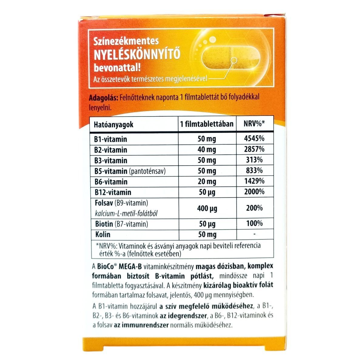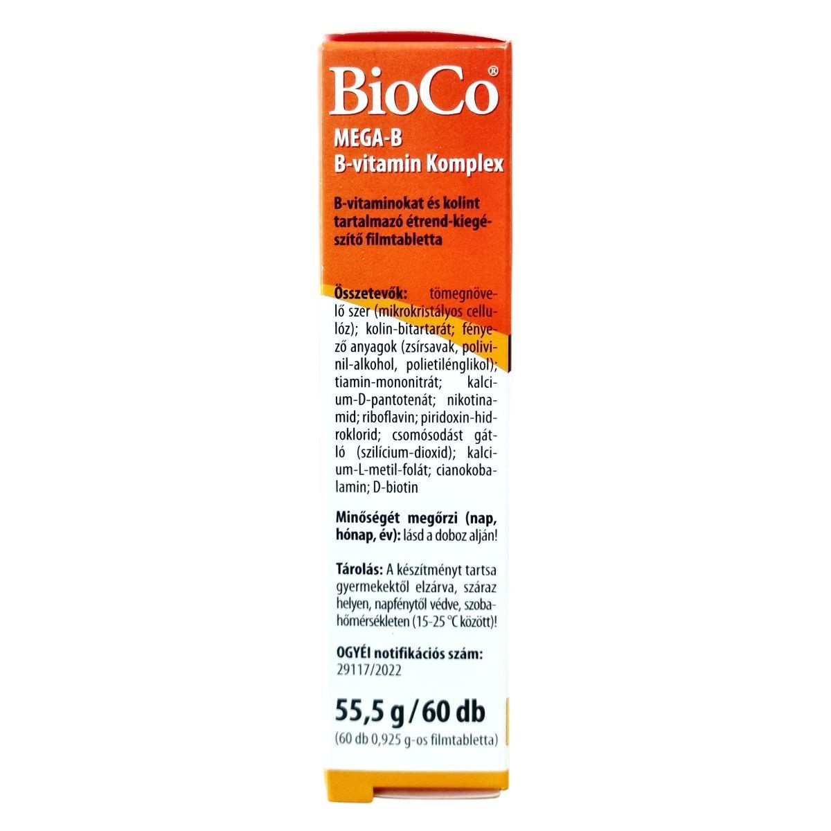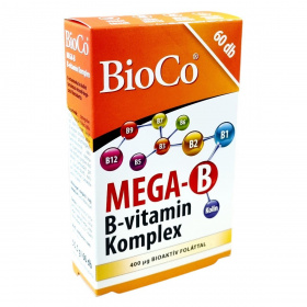 A BioCo MEGA-B B-vitamin Komplex egy Magyarországon fejlesztett és gyártott étrend-kiegészítő, amely magas dózisú, komplex B-vitaminokat és kolint tartalmaz. A készítmény kizárólag bioaktív folát formában tartalmaz folsavat, ezáltal jelentős mennyiségben (400 µg) járulhat hozzá a folátbevitelhez. A B1-vitamin segítheti a szív megfelelő működését, a B1-, B2-, B3- és B6-vitaminok támogathatják az idegrendszer egészségét, míg a B6-, B12-vitaminok és a folsav hozzájárulhatnak az immunrendszer normális működéséhez. A termék színezékmentes, nyeléskönnyítő bevonattal készül, amely megtartja az összetevők természetes megjelenését, és vegán, laktóz- valamint gluténmentes is egyben. A hatóanyagok nem Magyarországról származnak, de a gyártás és fejlesztés teljes egészében Magyarországon történik. Az élelmiszerbiztonsági rendszert az ISO 22000 szabvány és a Jó Gyártási Gyakorlat (GMP) irányelvei szerint tanúsítják.