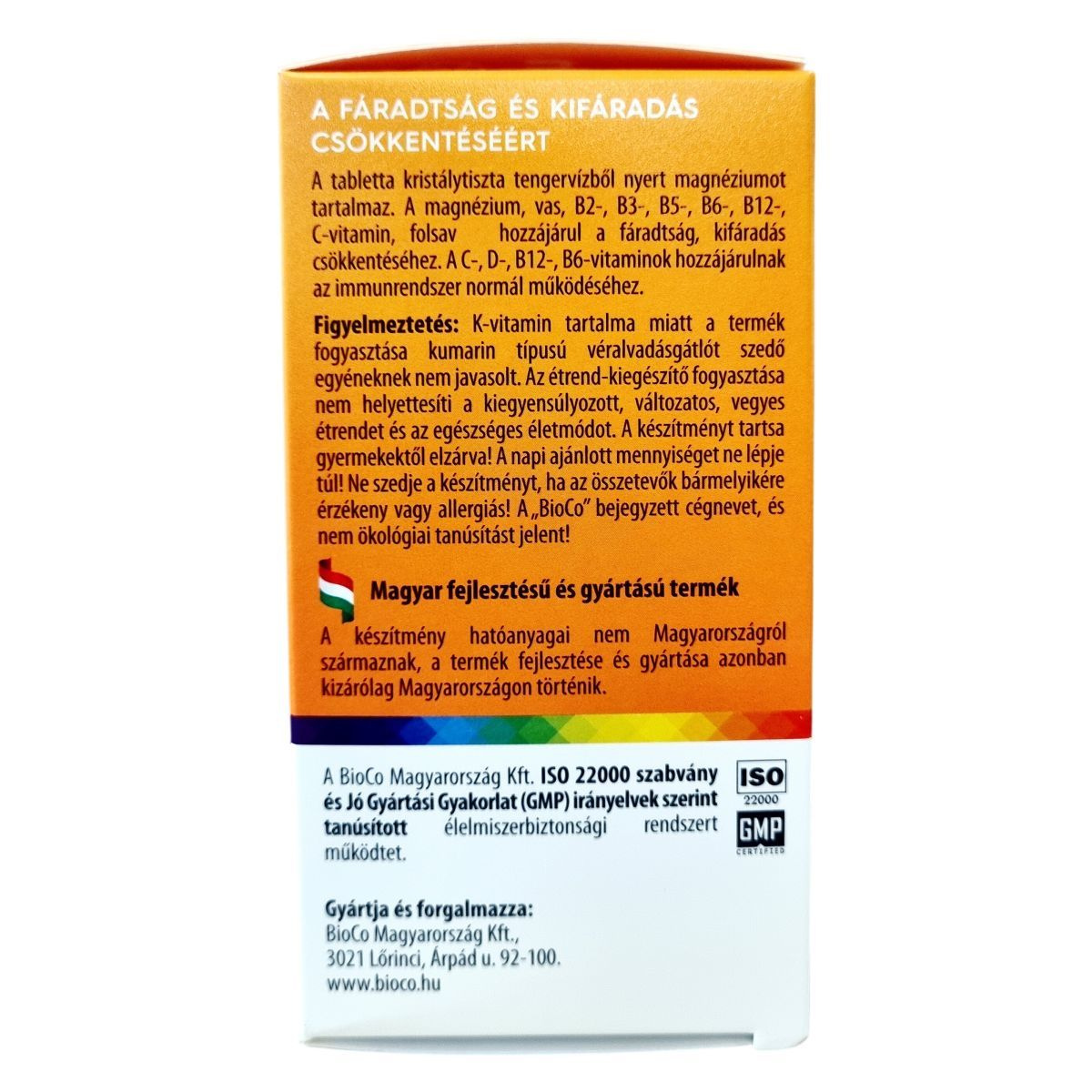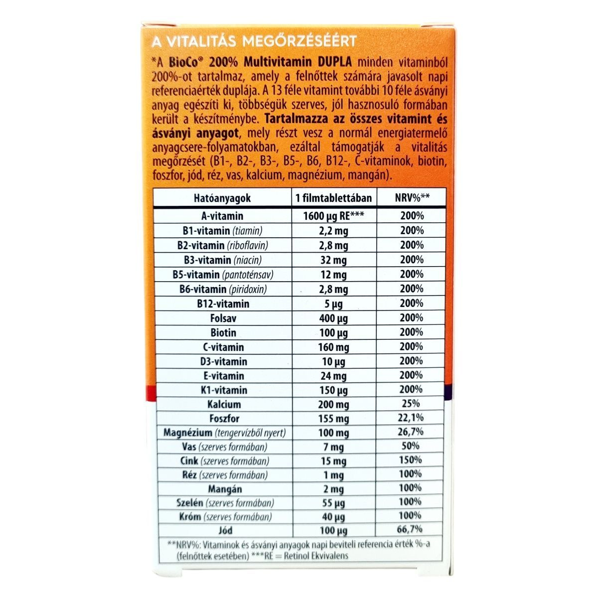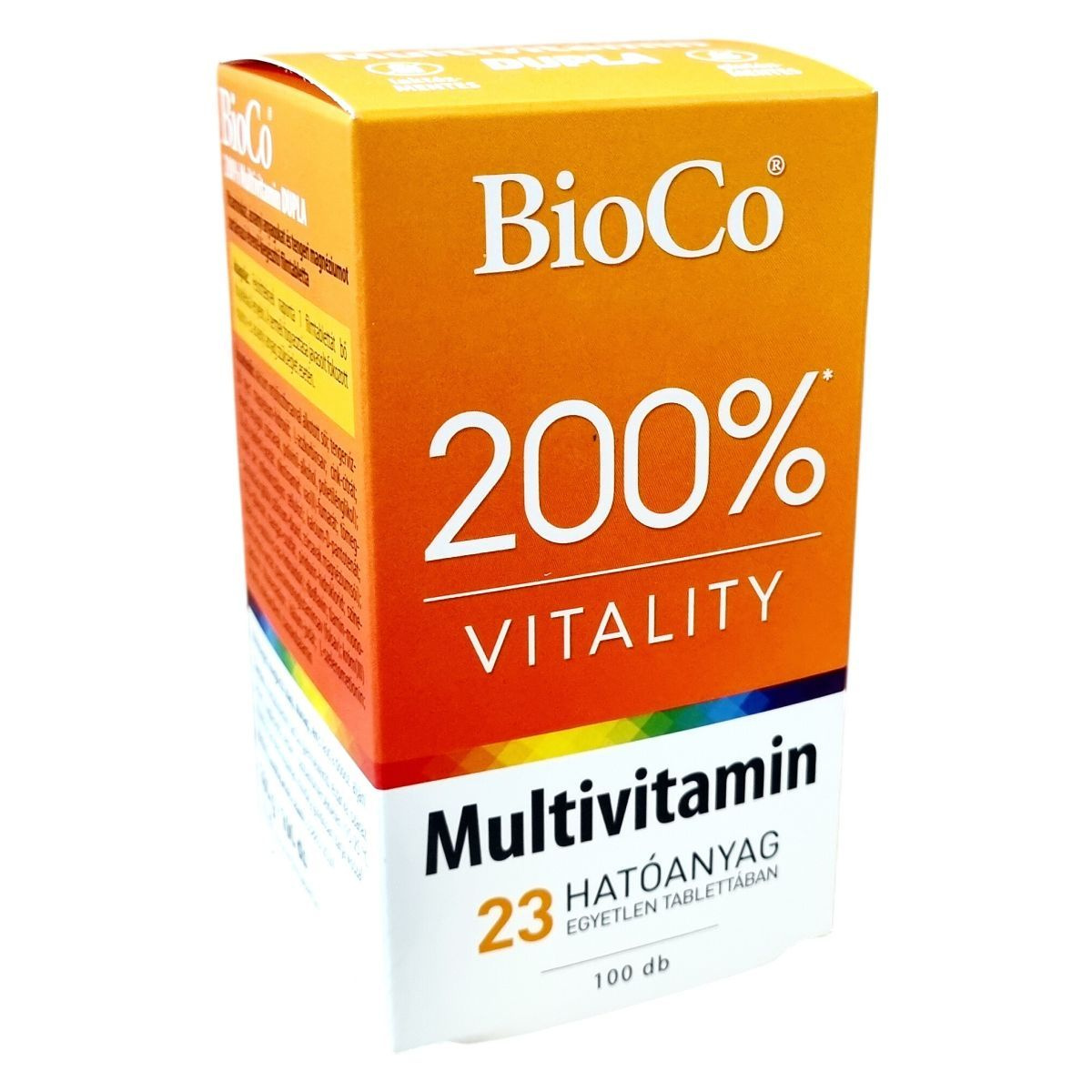 A BioCo 200% Multivitamin DUPLA egy magyar fejlesztésű és gyártású étrend-kiegészítő, mely 23 féle hatóanyagot tartalmaz egyetlen tablettában. A készítmény összetevői között megtalálhatók a fontos vitaminok és ásványi anyagok, melyek közül a legtöbb szerves formában, jól hasznosuló változatban került be a tablettába. A termék támogatni tudja a fáradtság és kifáradás csökkentését, valamint az immunrendszer normál működését. A készítményben kristálytiszta tengervízből származó magnézium is található. A BioCo Magyarország Kft. által gyártott termék megfelel az ISO 22000 szabványnak és a Jó Gyártási Gyakorlat előírásainak, amely garantálja a minőséget és biztonságot. A termék fogyasztása javasolt fokozott vitamin- és ásványianyag-szükséglet esetén, azonban nem helyettesíti a kiegyensúlyozott, változatos étrendet és az egészséges életmódot.