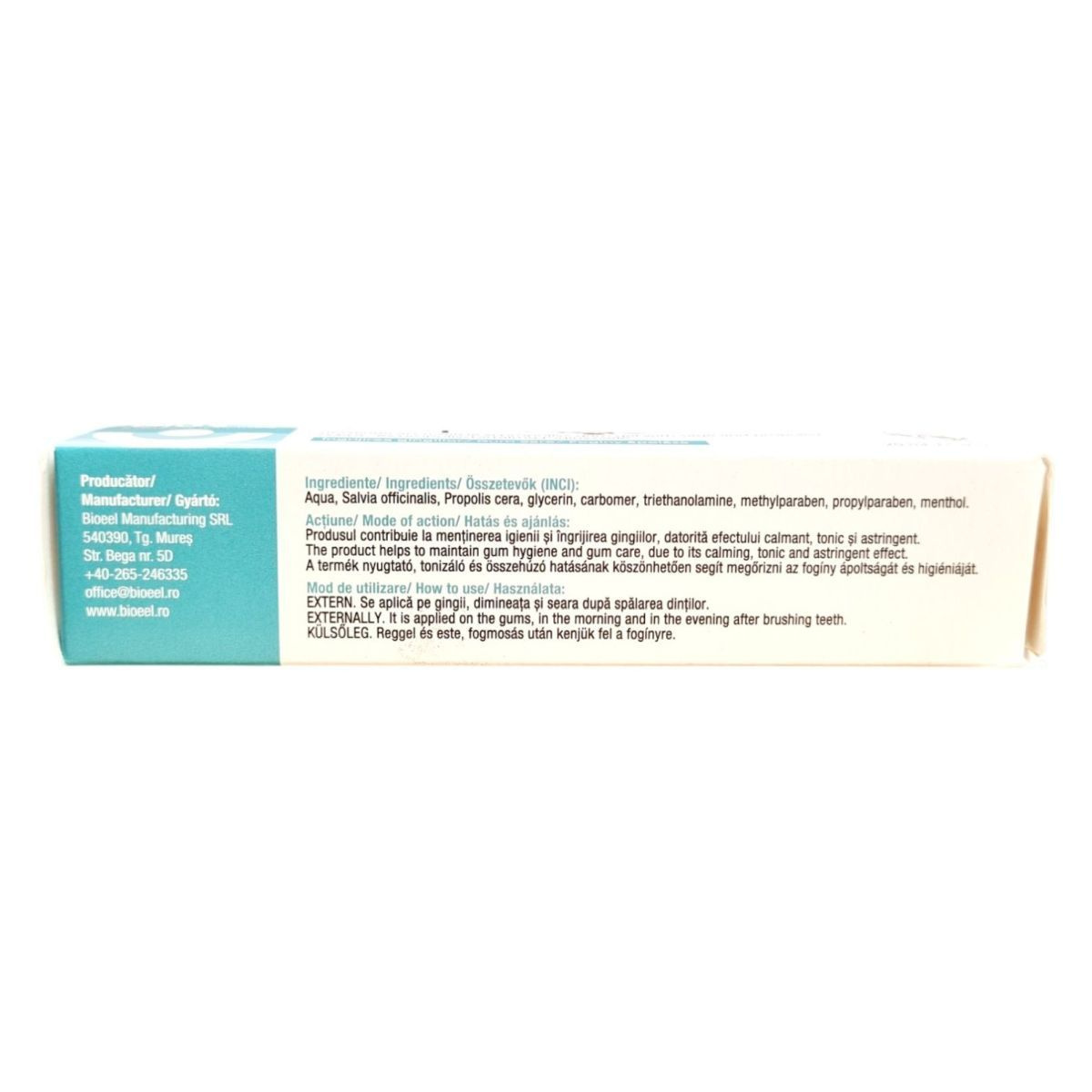 A Bioeel Salprogel egy zsálya- és propolisztartalmú fogínyzselé, amelyet a fogíny ápolására fejlesztettek ki. A termék nyugtató, tonizáló és összehúzó hatásának köszönhetően segíthet megőrizni az fogíny higiéniáját és ápoltságát. Külsőleg alkalmazandó, reggel és este, fogmosás után. A termék összetevői között megtalálható a Salvia officinalis és a Propolis cera, valamint további segédanyagok, mint a glycerin és a menthol. Fontos, hogy a terméket az eredeti csomagolásban, 15°C - 25°C közötti hőmérsékleten tároljuk, és kisgyermekektől elzárva tartsuk.