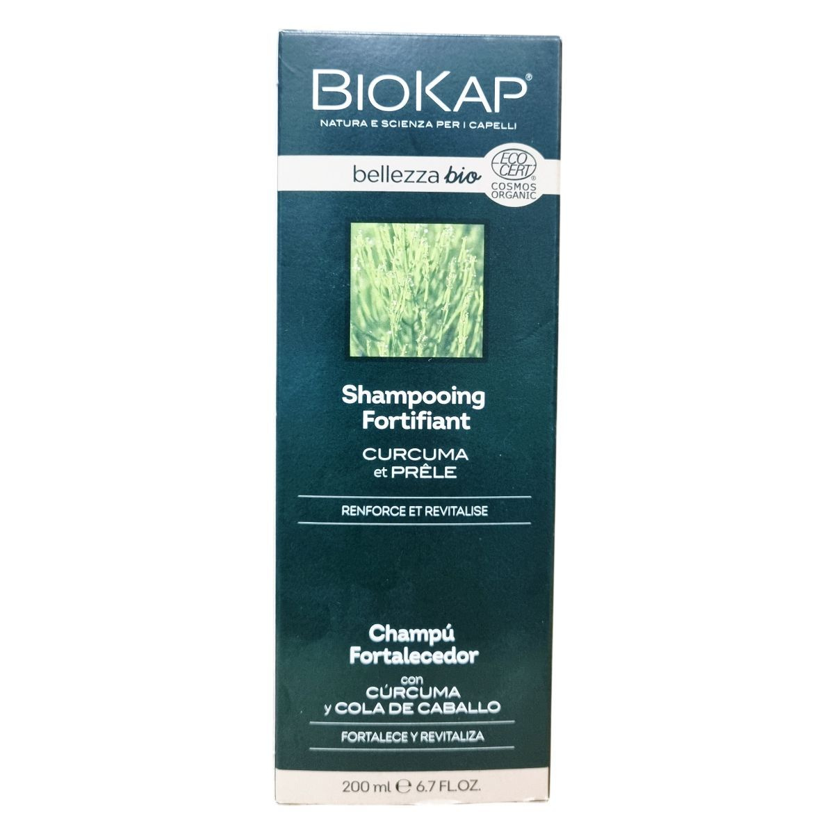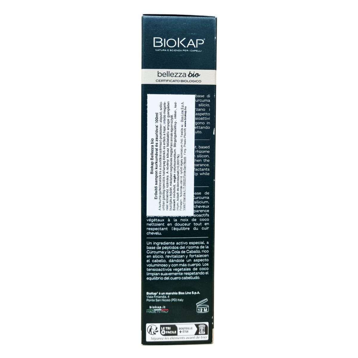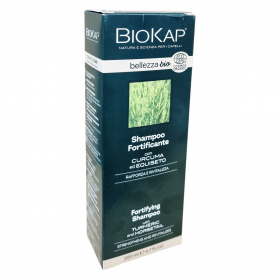 A Biokap erősítő sampon különleges hatóanyagokat tartalmaz, melyek között a kurkuma rizóma peptidei és a mezei zsurló kivonat, mely gazdag szilíciumban, a hajszálakat revitalizálja és erősíti, így a haj dúsabb, volumentelibb hatású lesz. A termék növényi eredetű kókuszolaj alapú felületaktív anyagokat használ, amelyek gyengéden tisztítanak, megőrizve a fejbőr természetes egyensúlyát. A sampon 97,97%-ban természetes eredetű összetevőket tartalmaz, melyekből 12,96% bio gazdaságból származik. A termék vegán, parabén-, paraffin-, ásványi olaj-, szilikon-, GMO-mentes, és dermatológiailag tesztelt. A csomagolás 100%-ban újrahasznosított PET anyagból készült, és megfelel a COSMOS ORGANIC szabványoknak, melyet az Ecocert Greenlife tanúsít. A sampon használata hozzájárul a haj egészségéhez, megfelelő gondoskodást nyújtva a mindennapi hajápolásban.