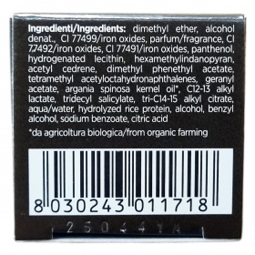 dimethyl ether, alcohol denat., CI 77499/iron oxides, parfum/fragrance, CI 77492/iron oxides, CI 77491/iron oxides, panthenol, hydrogenated lecithin, hexamethylindanopyran, acetyl cedrene, dimethyl phenethyl acetate, tetramethyl acetyloctahydronaphthalenes, geranyl acetate, argania spinosa kernel oil*, C12-13 alkyl lactate, tridecyl salicylate, tri-C14-15 alkyl citrate, aqua/water, hydrolyzed rice protein, alcohol, benzyl alcohol, sodium benzoate, citric acid