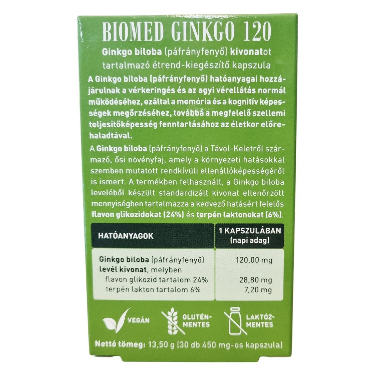 A Biomed GINKGO 120 kapszula Ginkgo biloba (páfrányfenyő) levél kivonatát tartalmazza standardizált formában, mely ellenőrzött mennyiségben tartalmaz flavon glikozidokat (24%) és terpén laktonokat (6%). A Ginkgo biloba ősi növény, amely a természetben kiemelkedő ellenállóképességgel rendelkezik. A termék nettó tömege 13,50 g, és 30 darab, egyenként 450 mg-os kapszulát tartalmaz, melynek kapszulahéja növényi eredetű. Forgalmazója a Biomed Kft., mely Magyarországon működik.