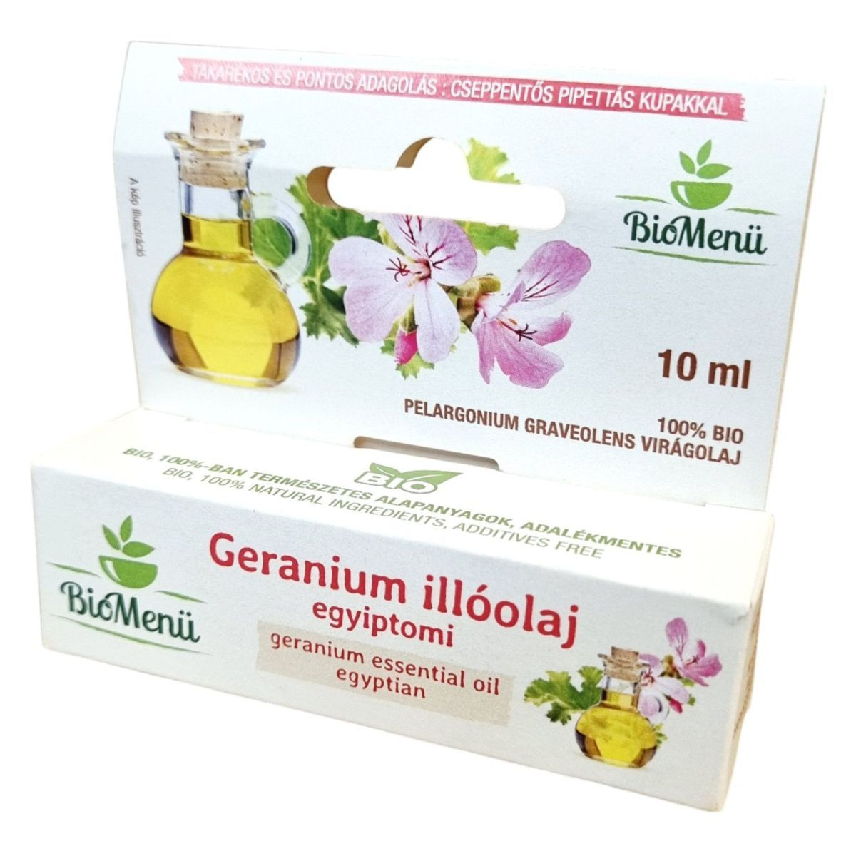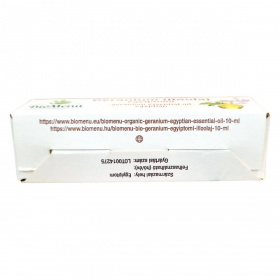 A BioMenü 100% BIO Pelargonium Graveolens virágolaj egy kiváló minőségű, egyiptomi eredetű geranium illóolaj, amely rózsás-mentolos illatával és világossárga-mélysárga-sárgászöld színével tűnik ki. A termék cseppentős pipettás kupakkal van ellátva, ami takarékos és pontos adagolást tesz lehetővé. Az olaj adalékmentes, 100%-ban természetes alapanyagokból készült, és széles körben alkalmazható aromaterápiában, parfümökben, krémekben és testápolókban. Emellett hatékony lehet szorongás, depresszió, fertőzések és fájdalom kezelésére is. Fontos azonban figyelni a használat során, mivel bőrirritációt és allergiás reakciókat okozhat, ezért védőfelszerelés használata ajánlott.