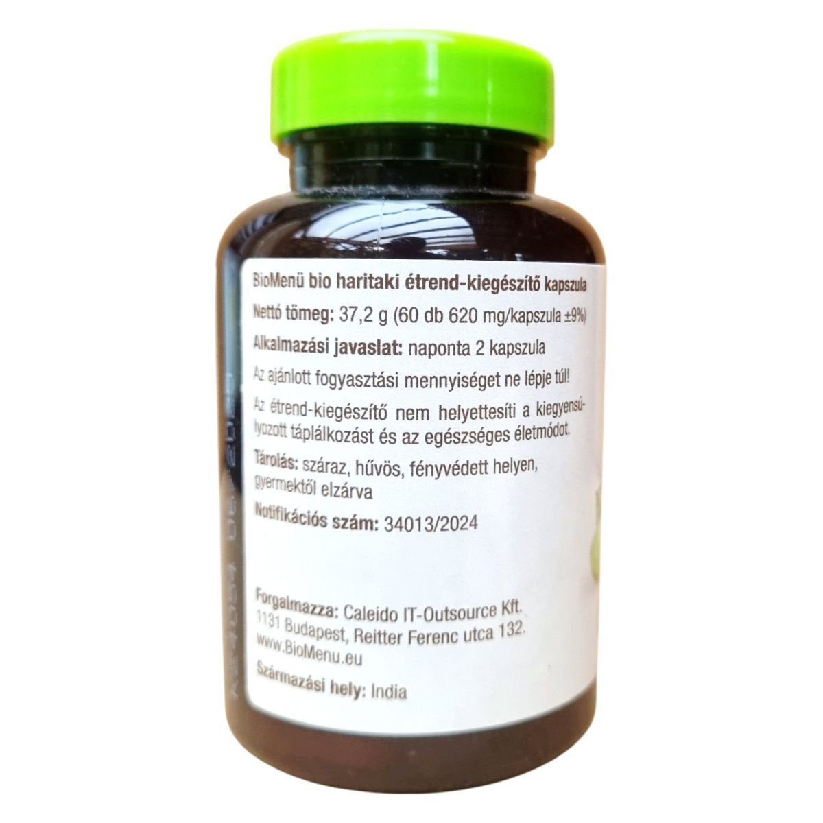 A BioMenü Haritaki kapszula egy 100% bio, vegán és raw étrend-kiegészítő, amely 60 kapszulás kiszerelésben kapható. A termék fő összetevője a bio haritaki por, amelyet Indiából származó alapanyagokból készítenek. A termék csomósodást gátló anyagot is tartalmaz, valamint a kapszulahéj hidroxipropil-metil-cellulózból készült. A termék minőségét a HU-ÖKO-02 tanúsítvány garantálja, és a Notifikációs szám alapján is regisztrált. A termék alkalmazása során fontos, hogy az ajánlott napi mennyiséget ne lépjük túl, és tartsuk be a tárolási javaslatokat.